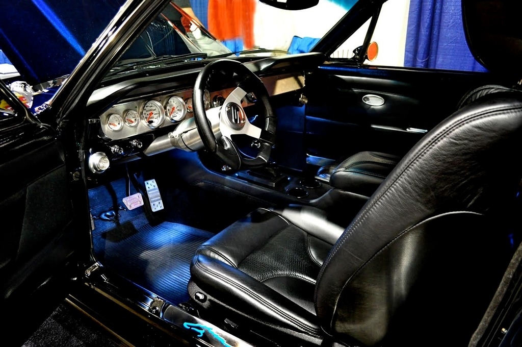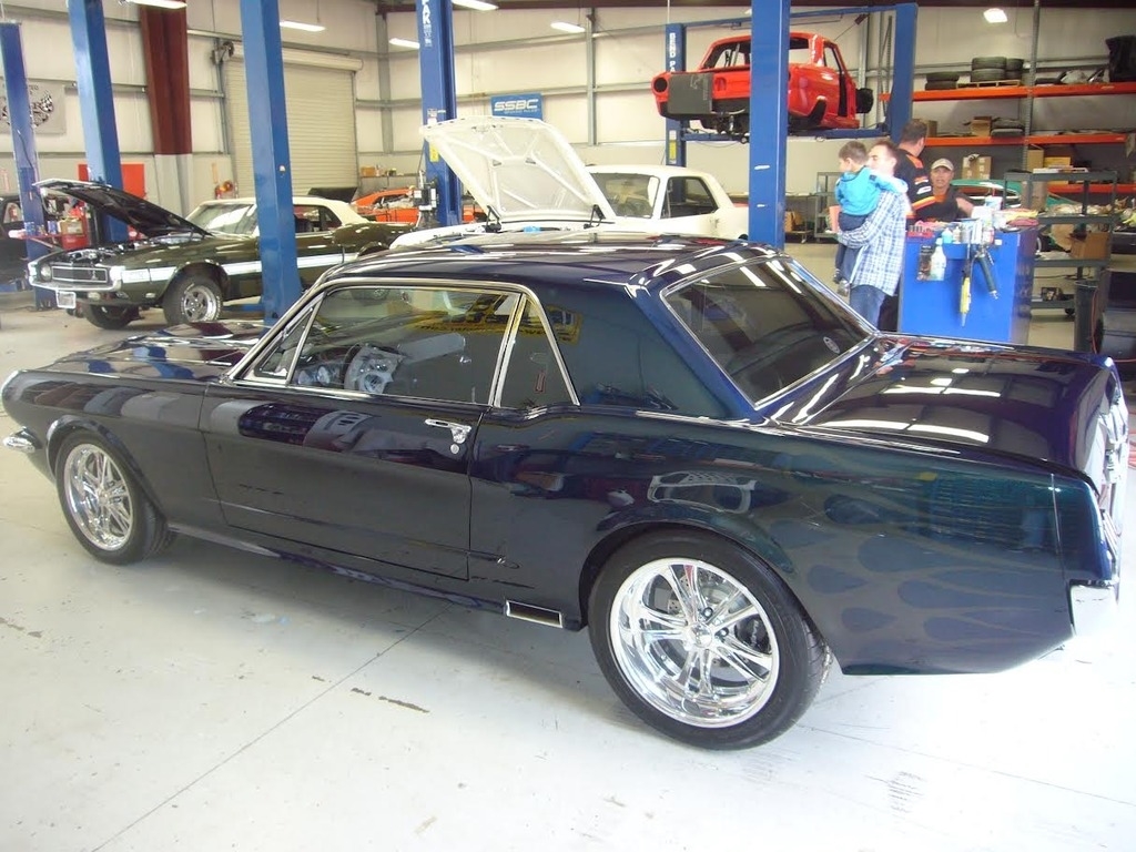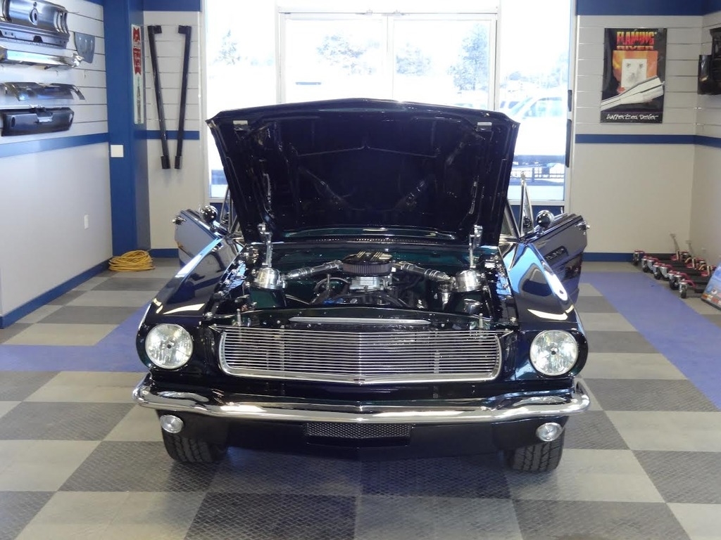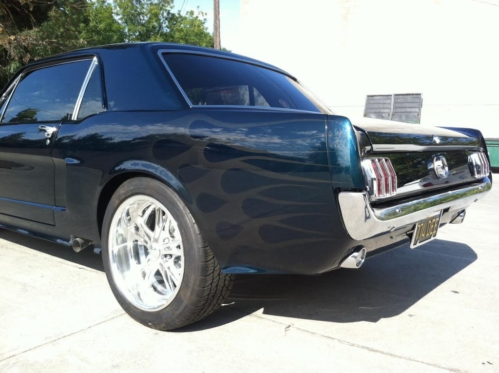 This Mustang is powered by a Roush 342RE engine paired with a TCI StreetFighter automatic transmission. It is shown with a custom Aquarius Kameleon Pearl exterior with ghost flames and a black Italian leather interior. This vehicle has been fully restored and well-maintained.