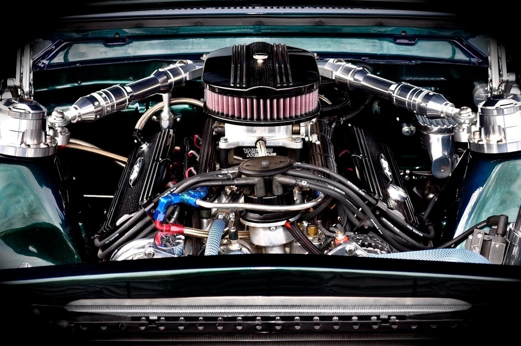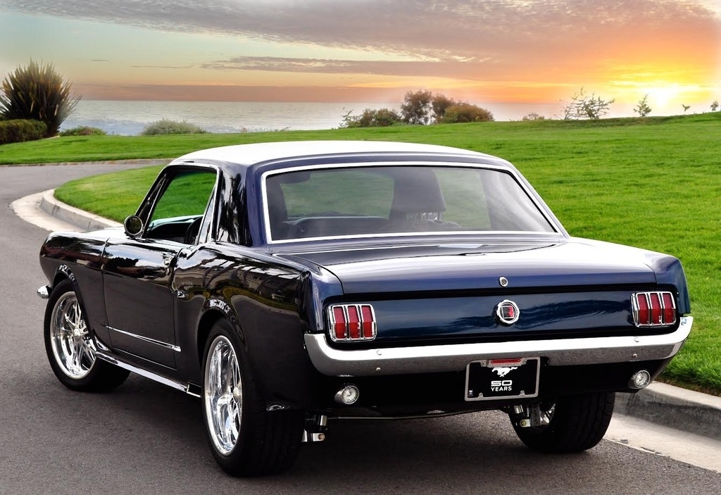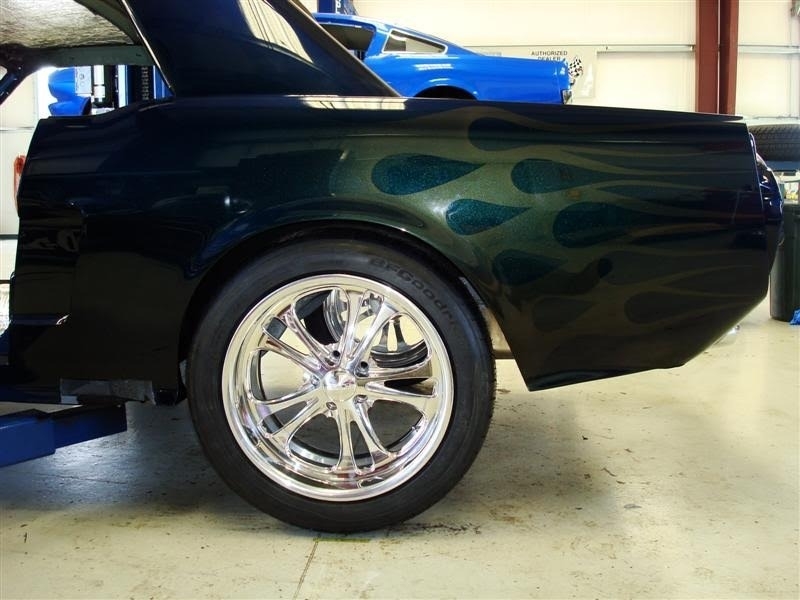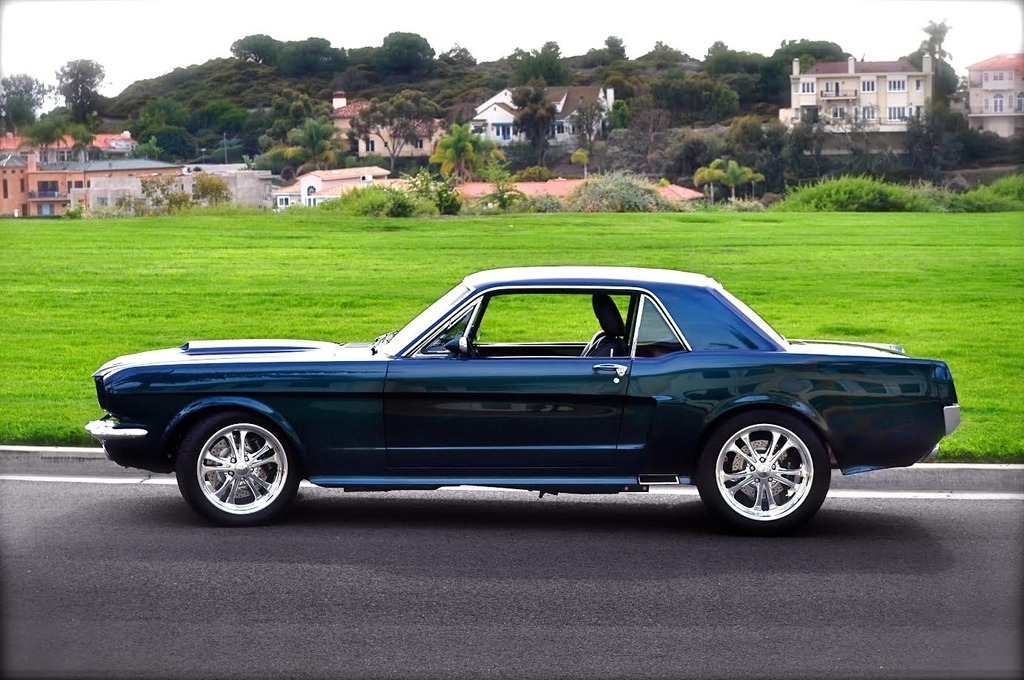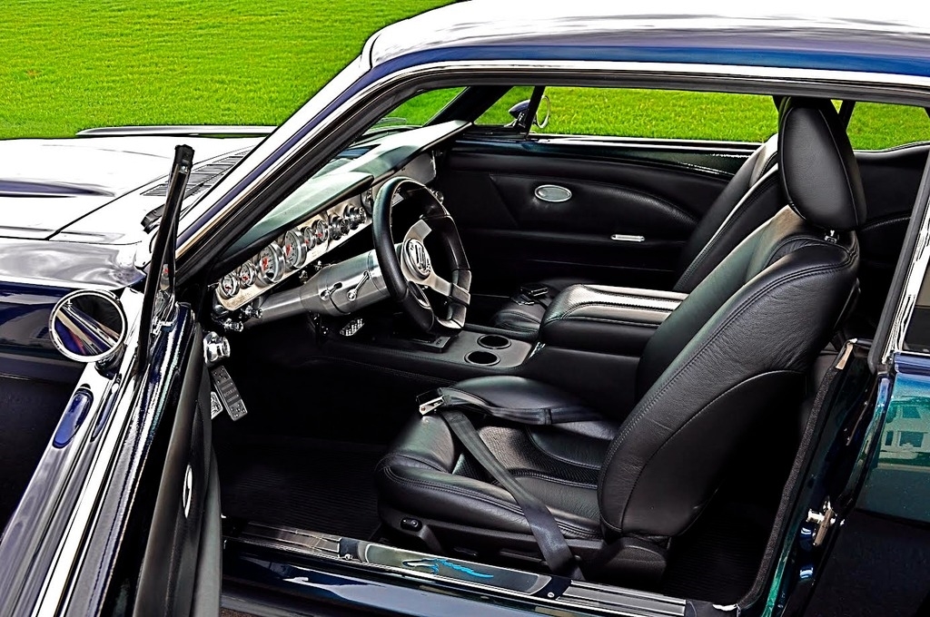 This Mustang is powered by a Roush 342RE engine paired with a TCI StreetFighter automatic transmission. It is shown with a custom Aquarius Kameleon Pearl exterior with ghost flames and a black Italian leather interior. This vehicle has been fully restored and well-maintained.