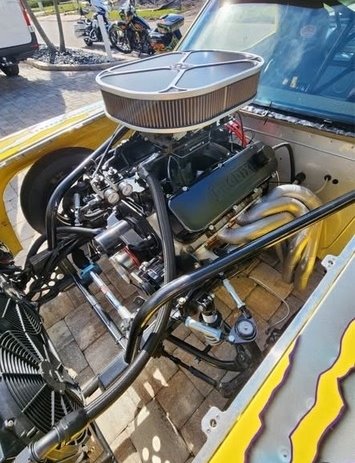 Performance big block. The engine features a GM bow-tie block, Ross pistons,