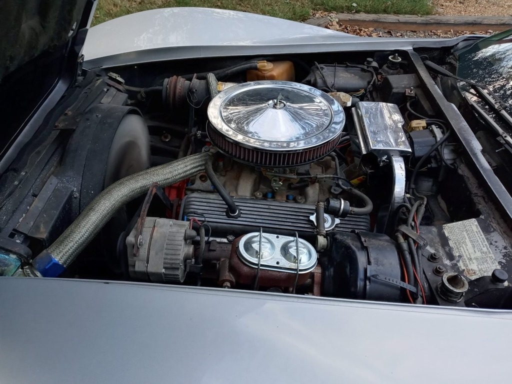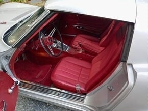 This Corvette is powered by a 350 V8 engine paired with a 3-speed automatic transmission. The odometer reads 23,337 miles and is shown with a Platinum Grey exterior and a red leather interior. This vehicle has been non-smoking, garage-kept, and well-maintained.