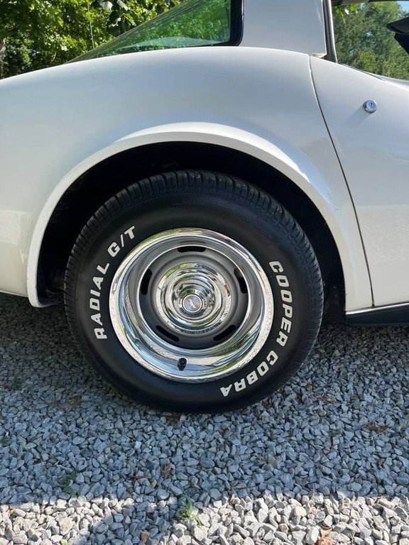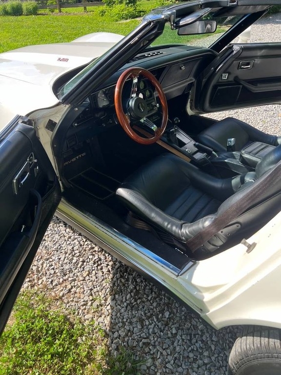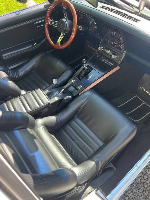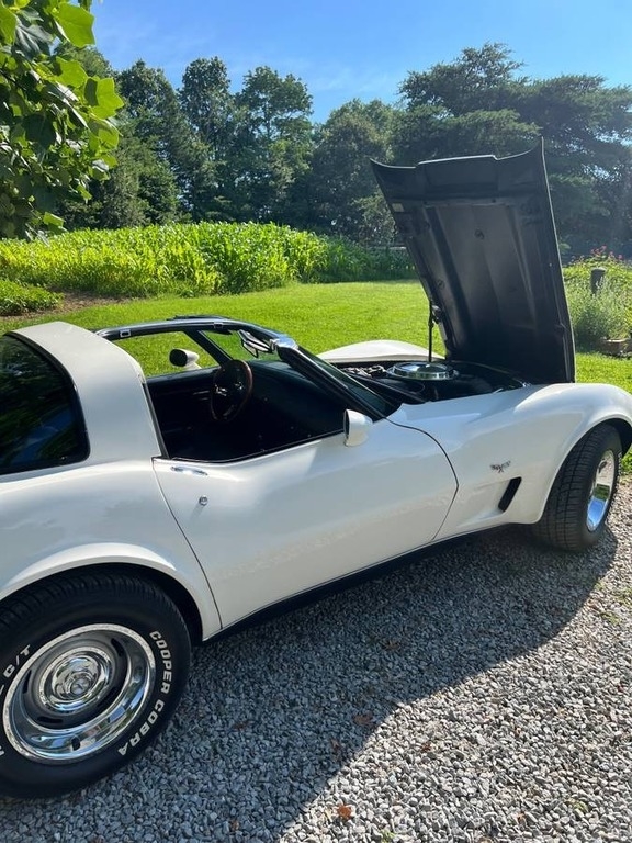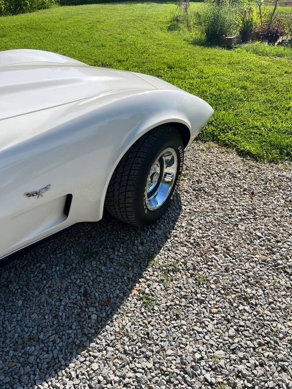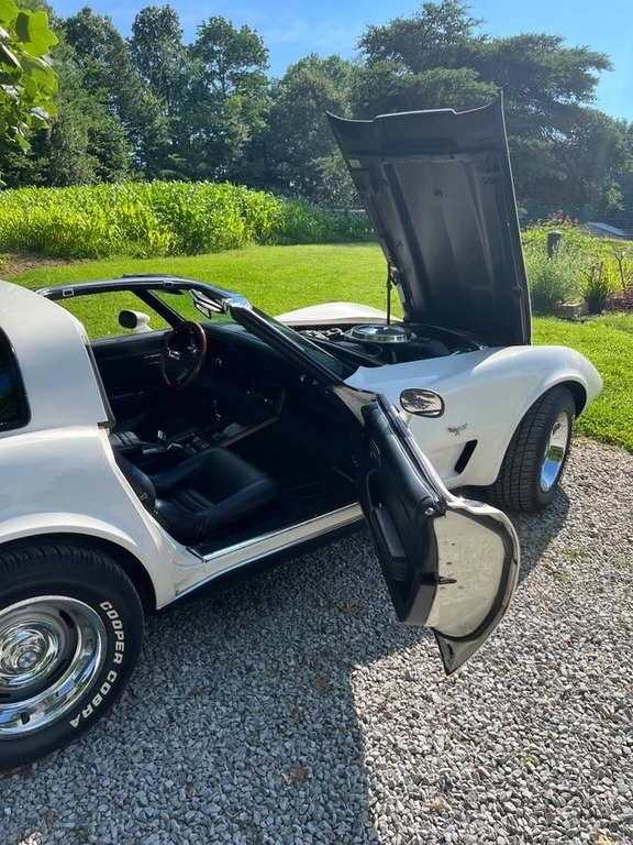 This Corvette is powered by a built 350 (now 355, 30 over) with only 1353 miles, paired with an Muncie 4 Speed manual transmission. Shown with a White Exterior and Black leather Interior. Garage Kept.