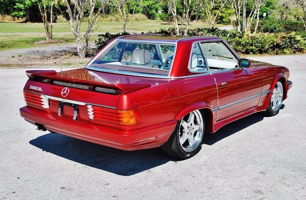 You will love our Ultra Rare Candy Apple Red 1984 Mercedes-Benz 500SL Roadster Convertible with a $7000 Lorimar Body Kit. They only made 1100 of these machines and they were only released in Germany. It all starts with a powerful 5.0 Liter V8 power plant that is tied to a smooth shifting Automatic transmission that delivers prestigious straight line performance. Behind the scene is an amazing balance of power allows a superstar look along with a nimble stance. Can't you just picture yourself behind the wheel? We can! Check out the Chrome AMG wheels with near new Z Rated tires, they are amazing with the stance of this machine. Straight lines, distinctive spoiler, and lower body work balances this luxury 500SL out with the White Leather.