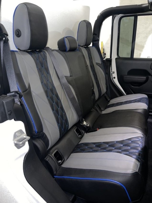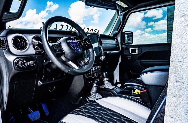 Gladiator is shown with a white exterior and a black leather interior. This Gladiator