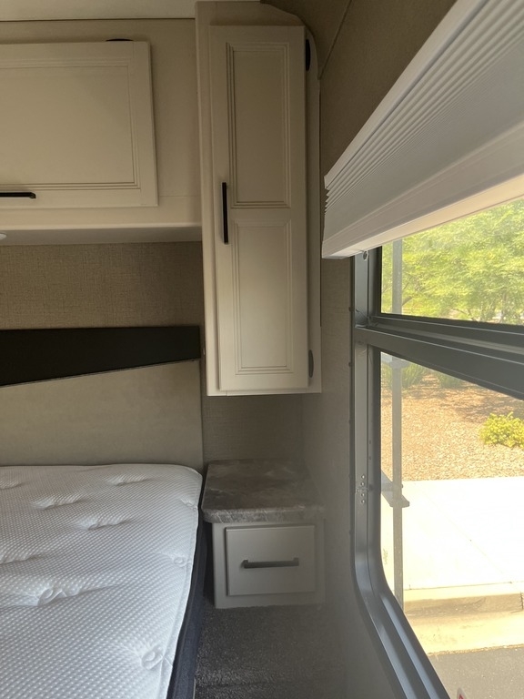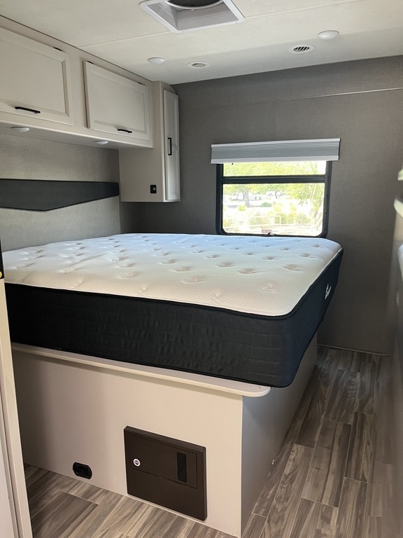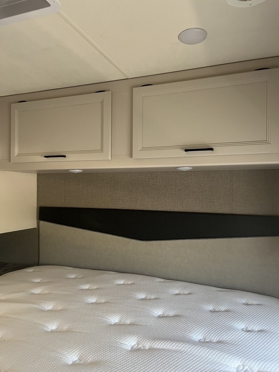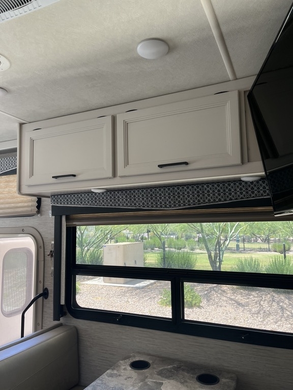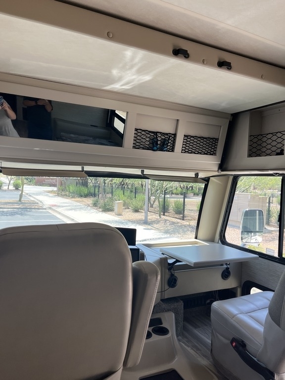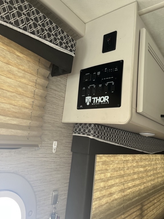loft bed above front cabin, window treatments and privacy shades, 12-volt attic