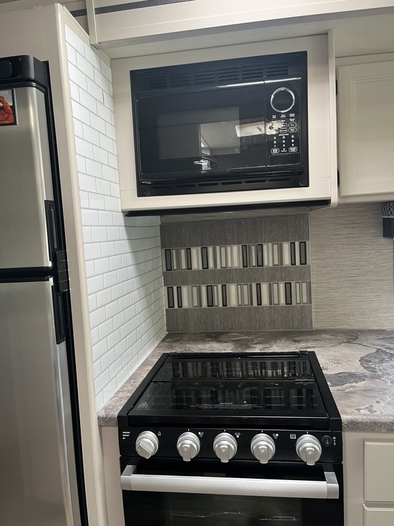 refrigerator/ freezer, 3 burner gas cooktop, microwave, glass tile backsplash,