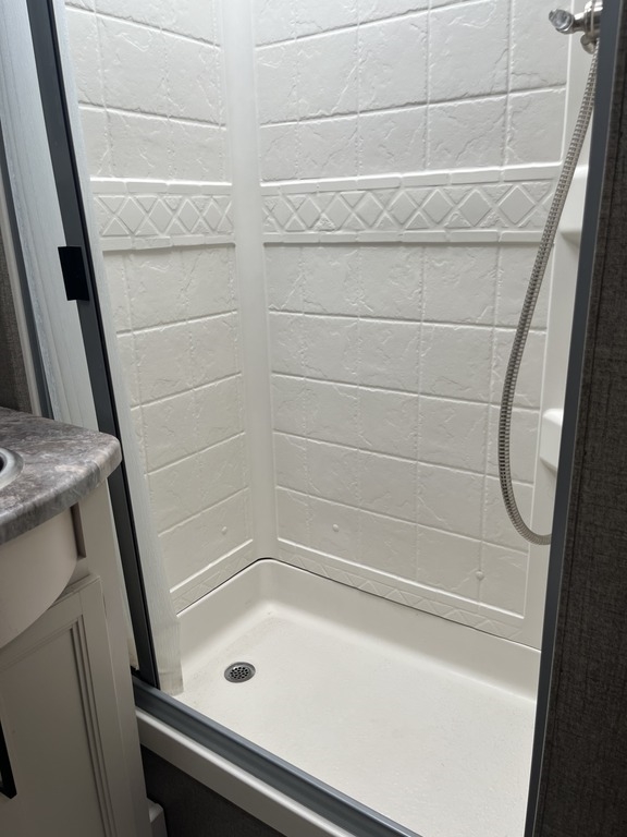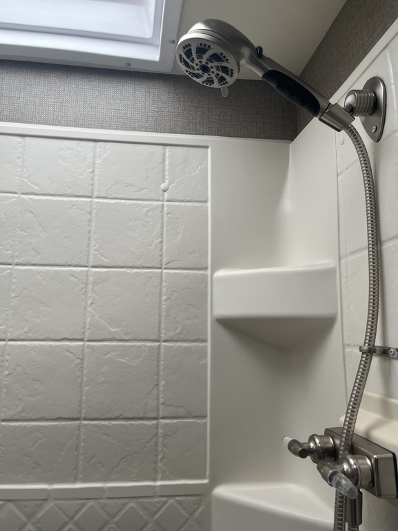 vinyl backsplash near stove for easy cleaning, Bathroom: shower storage drawer,