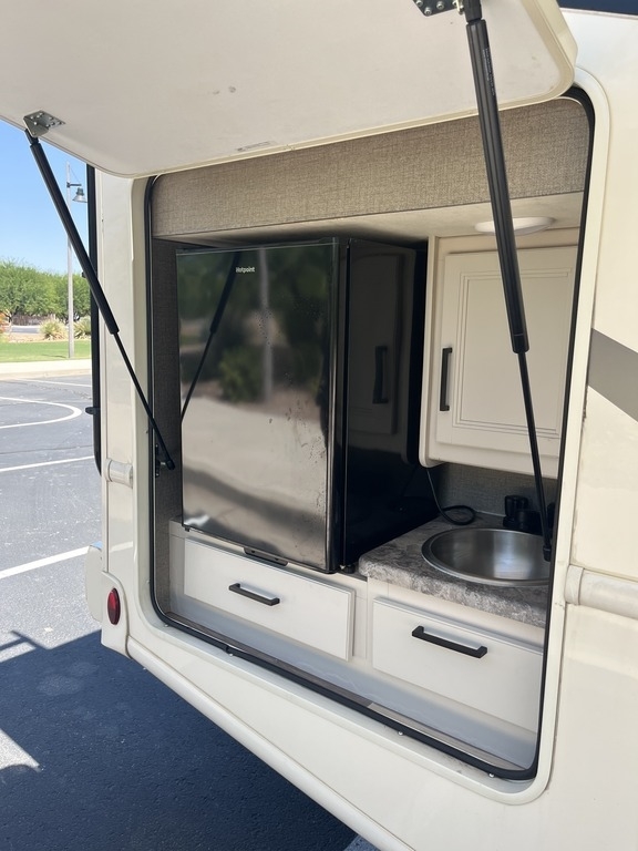 tv, refrigerator and sink. The exterior has sharp graphics with partial paint, 19-foot