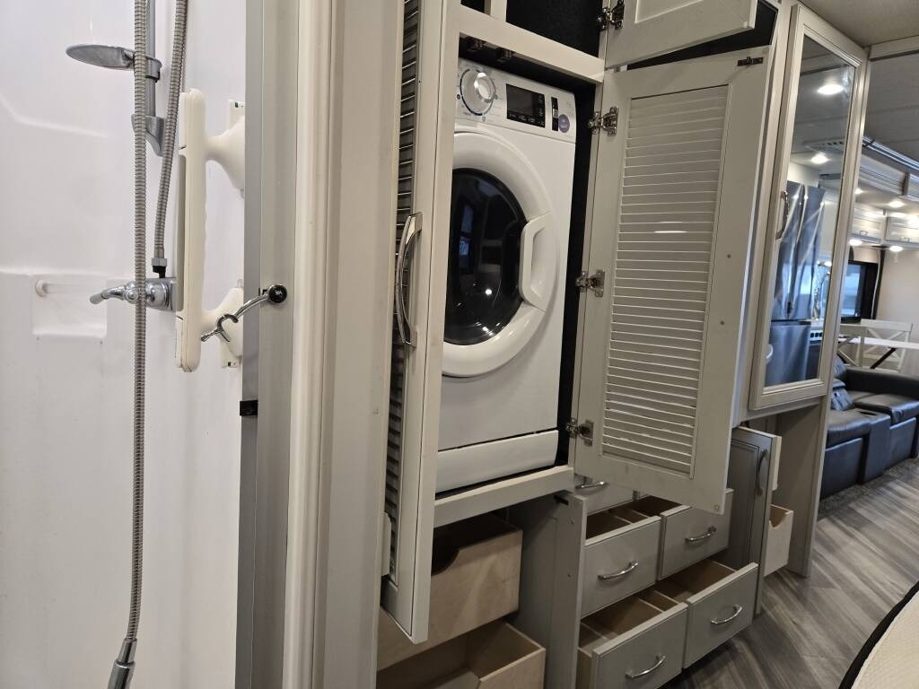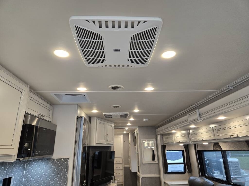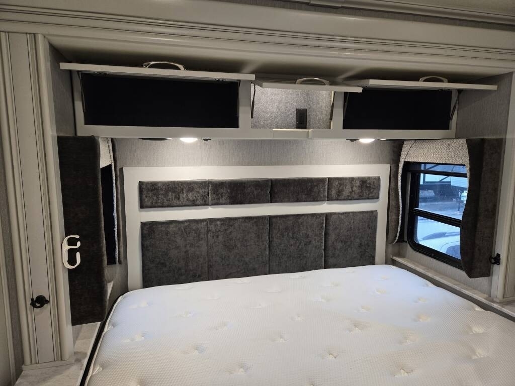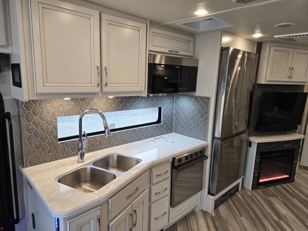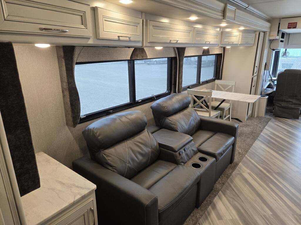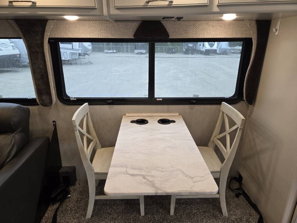 This Fleetwood is powered by a 7.3L Ford Triton V8 engine and a 6-speed automatic transmission with 9,300 miles. The overall length is 36.25 feet and it comes equipped with 2 power retractable slide-outs, a power retractable awning with LED lighting, 2 A/C units, a generator, 1½ baths, a fireplace, washer/dryer, outdoor entertainment, and plenty of room to sleep 6. This unit has been well-maintained.