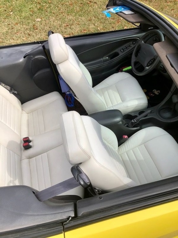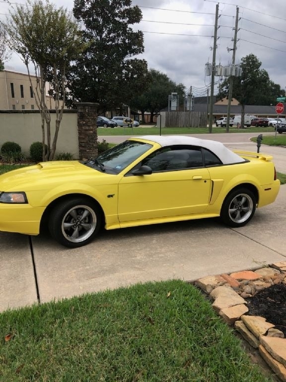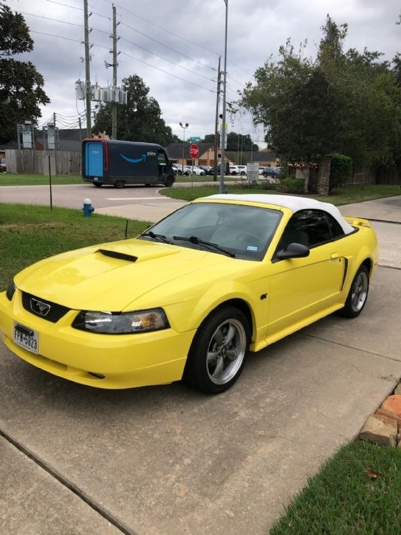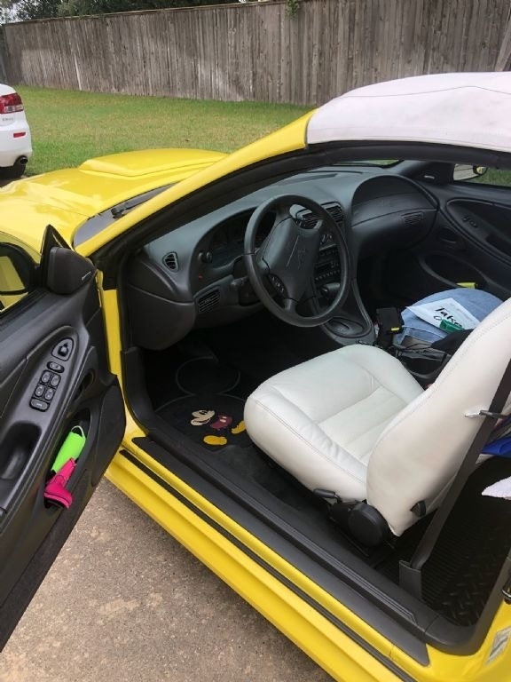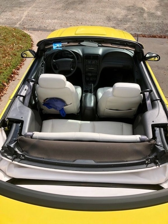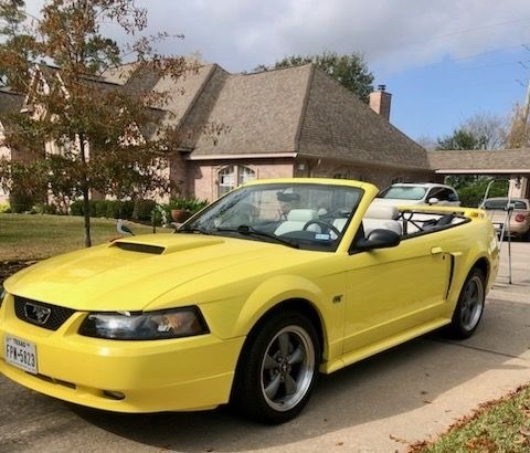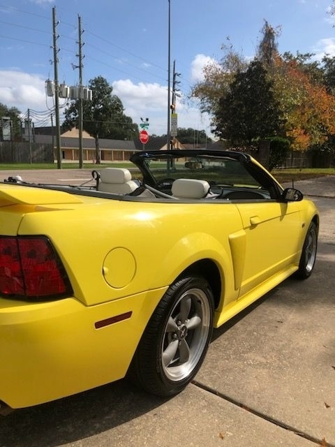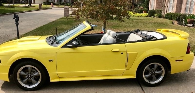 This All-Original Mustang is powered by a 4.6L V8 Engine paired with a Automatic Transmission with 58,500 Miles. Shown with A Yellow Exterior w/ White Top and Grey with White Leather Interior.