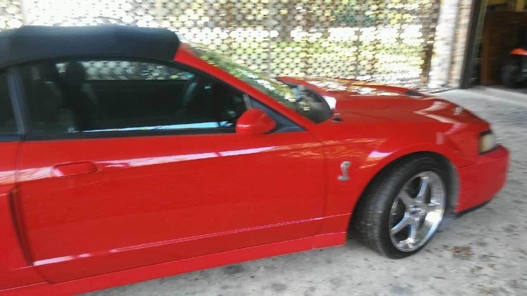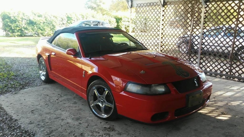 Our 2004 Ford Mustang Cobra Convertible is an amazing ride shown in Race Red under a Black Top and matching leathers! This is a total attention getter. With superior performance and styling, there are so many reasons to take the long way home. You will be floored by the 390hp courtesy of a 4.6 Liter 32V V8 tethered to a Manual gerbox. It'd be a blast to drive on the interstate or if you're smoking the tires at a light. You will love the hood graphics, hood pins, and chrome wheels. Peek inside, check out the roll bar and custom seating. Great amenities to add to this great car include an Alarm System, Keyless Entry, and a 5 Disc CD player.