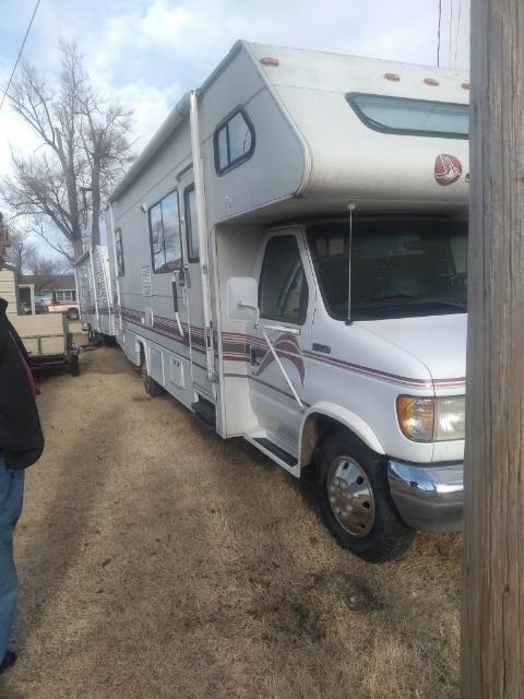 This 1995 Jayco Eagle is powered by a 460V8 Gasoline Engine combined with a 4-speed Automatic Transmission on a Ford Chassis, with 75,000 Miles. The overall length is 30' and comes equipped with an Onan 4,000 Generator, 1 Awning, 1 A/C unit and plenty of room to sleep 7.