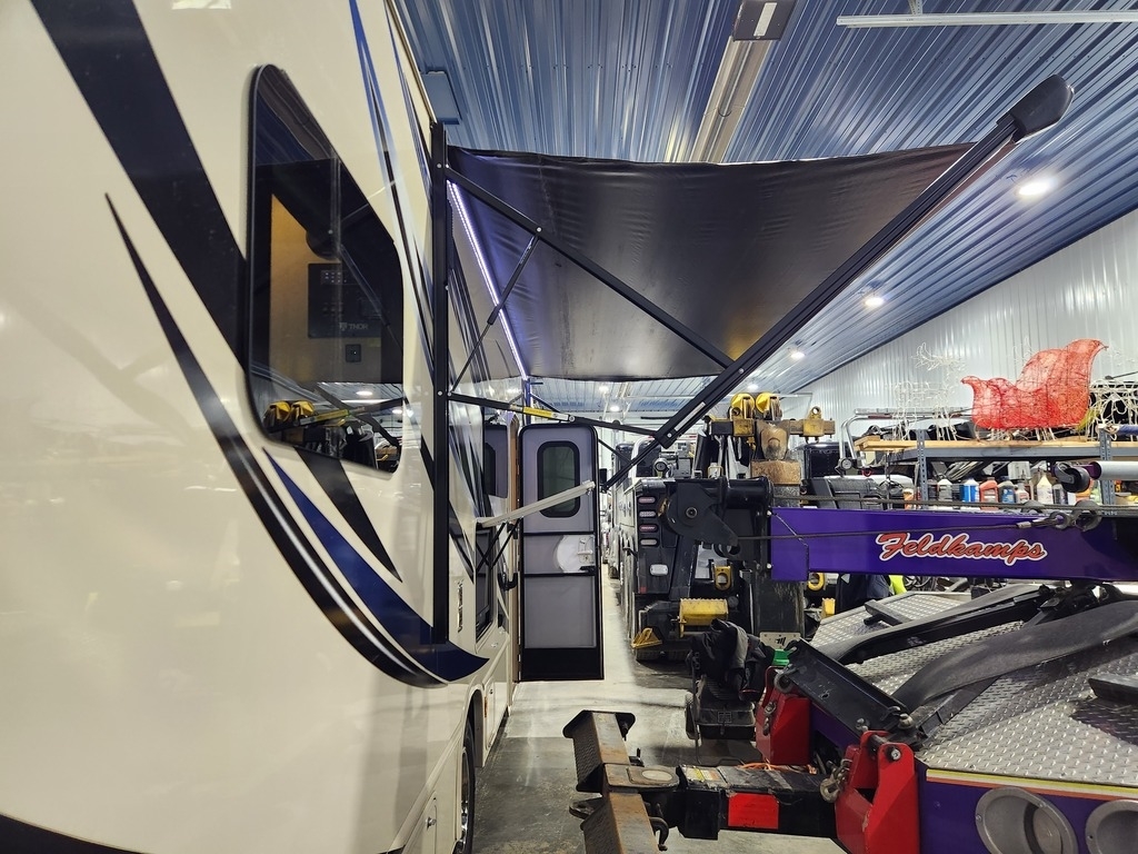 feet long and comes equipped with a slide out, three patio awnings, three air