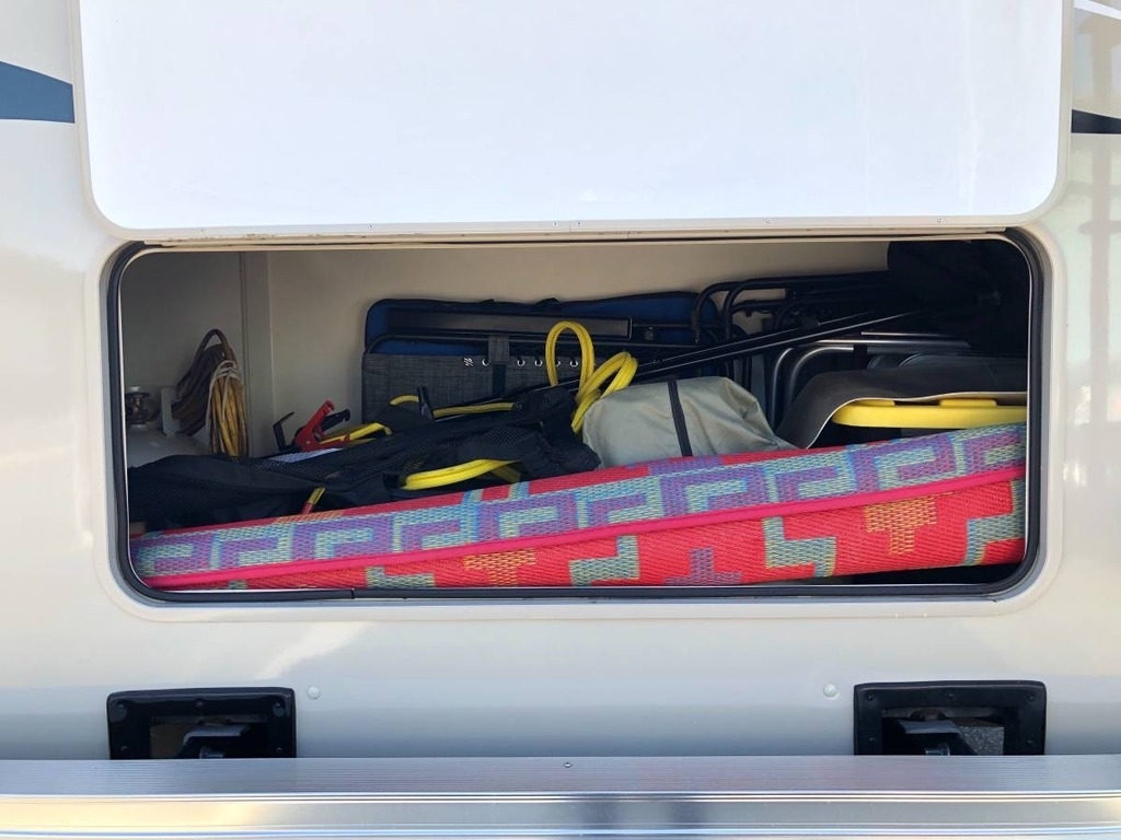 Seller is including coffee maker, dishes, bedding, folding chairs, new camp stove, removable table in storage compartment, outdoor rug, four seat picnic table with carrying case, and an adorable propane fire pit.