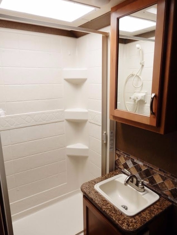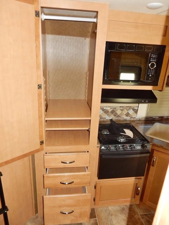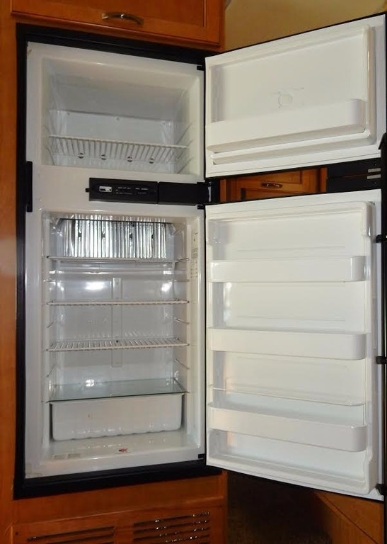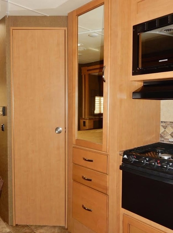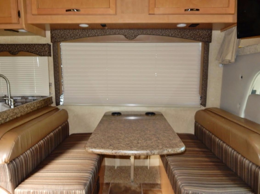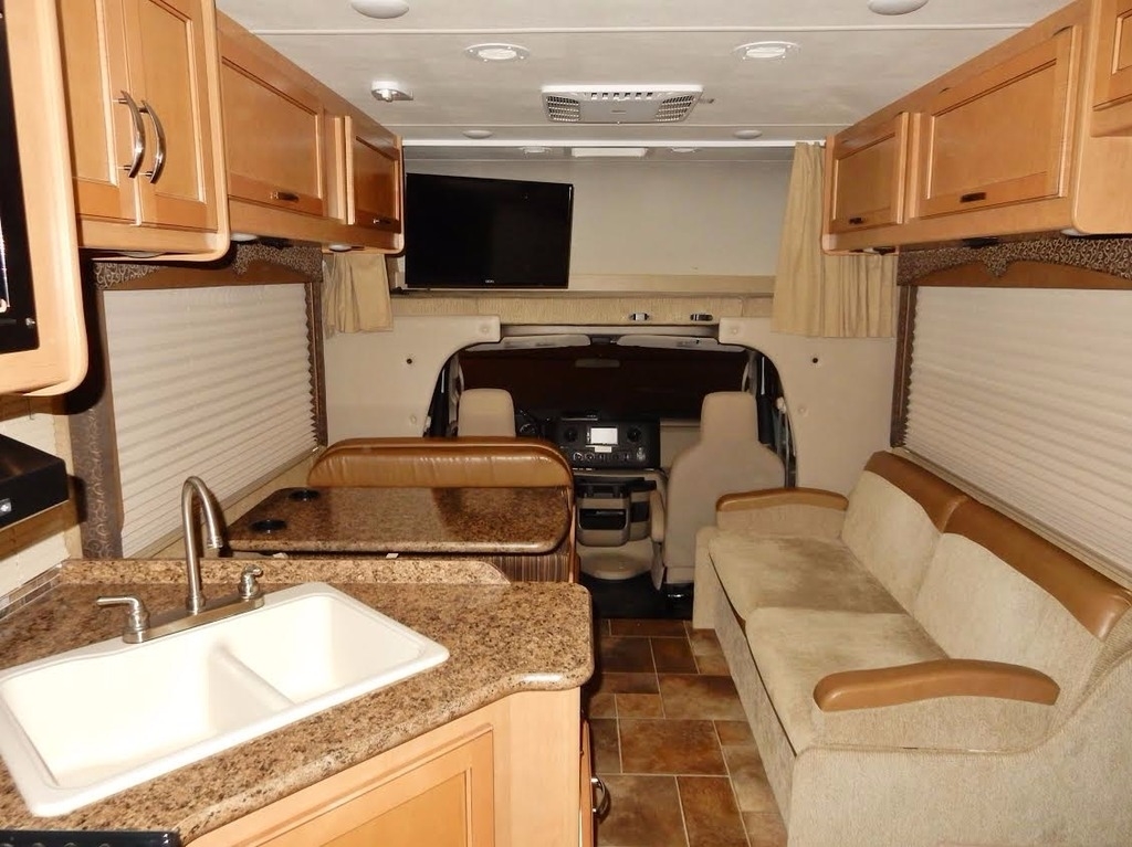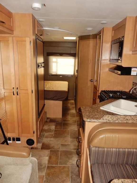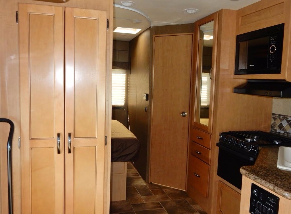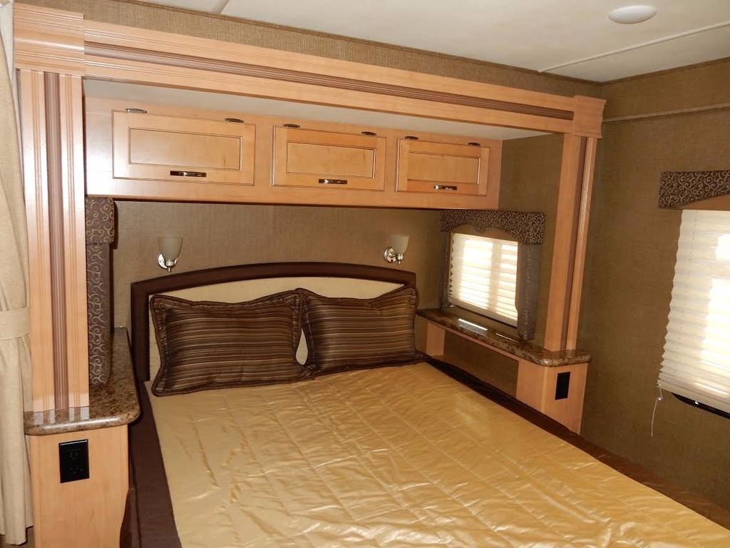It features a queen bed slide-out w/walk- around (the bedroom is beautifully framed and appointed), full bath (large shower) and ceramic commode, generous mirrored closet, 32” TV & DVR, large fridge, freezer, microwave, numerous kitchen cabinets, comfortable and roomy dinette, sofa/bed, and plenty of storage in the front, over- cab bed. 4.0 Cummins generator. Used only by the owners who neither smoked nor traveled with pets.