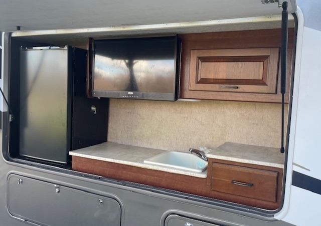 slide-outs, 1 power retractable awning, 1 A/C unit, an outdoor kitchen, and