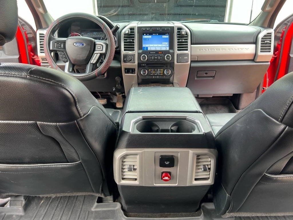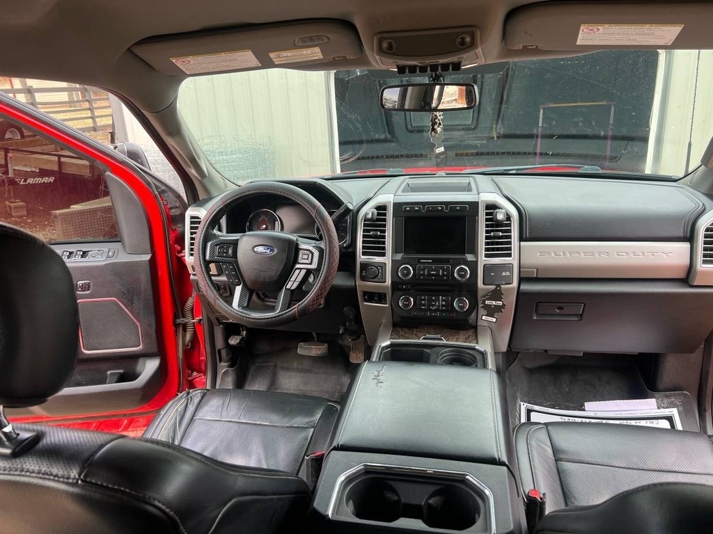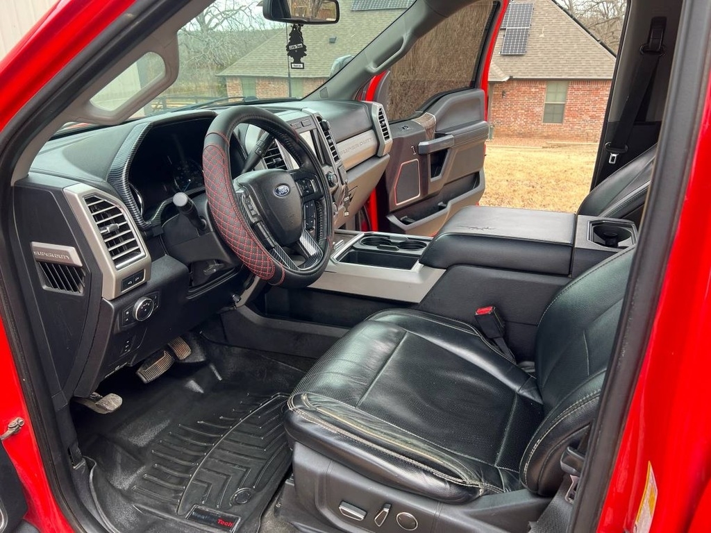 This Ford F-250 is powered by a 6.7L V8 turbo diesel engine paired with an automatic 6-speed transmission. It has 178,571 miles and is shown with a red exterior and a black leather interior.