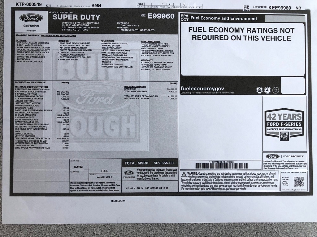 This 2019 Ford F-450 Super Duty XLT 4X4 Pickup is powered by a turbocharged 6.7L Power Stroke V8 diesel engine paired with a 6-speed automatic transmission. This truck has approximately 70,705 miles. This Ford F-450 is shown with a White exterior and a gray interior. Always dealer serviced. All maintenance is current including recent oil change.