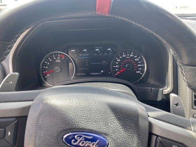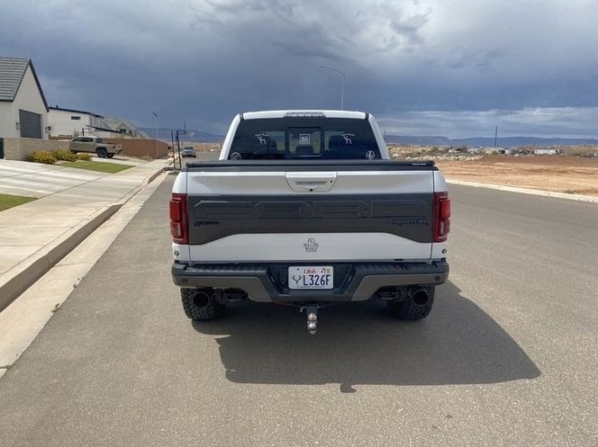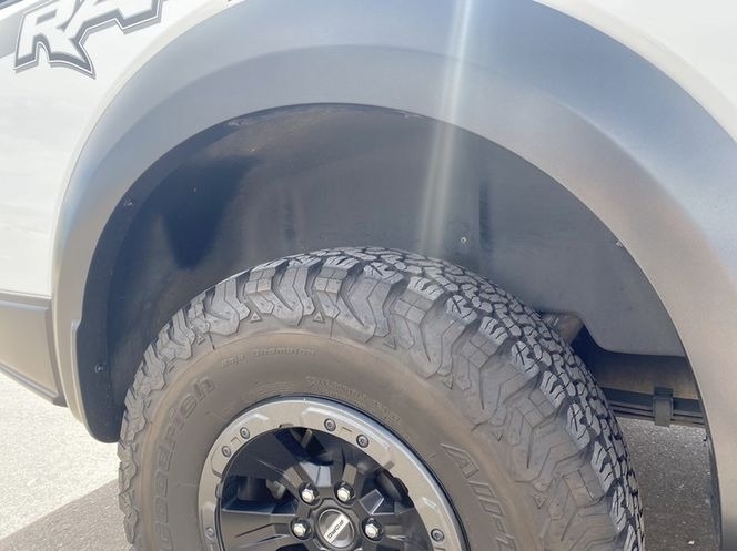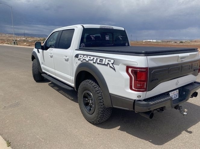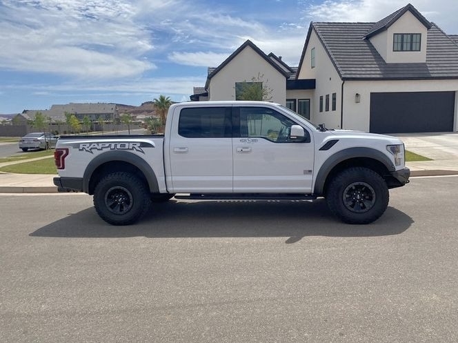 Raptor is Shown in a White exterior and Black Leather Interior, has been Garage