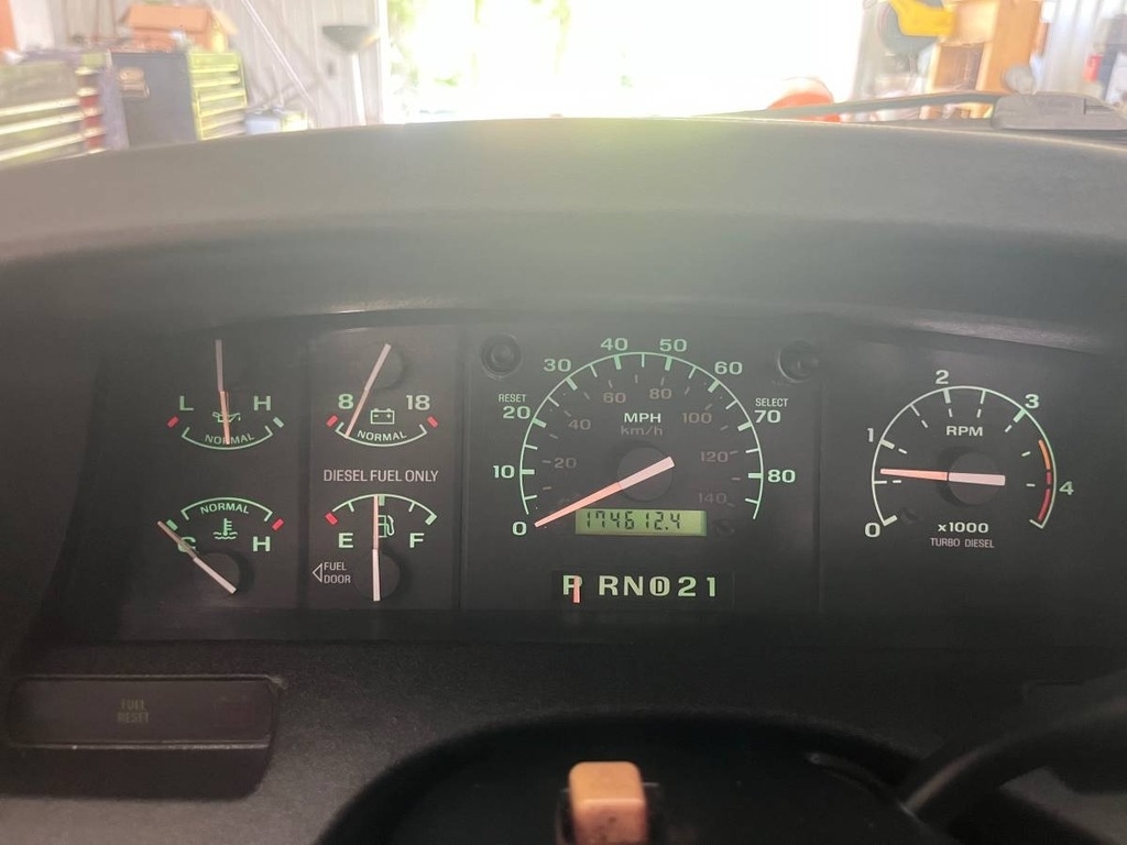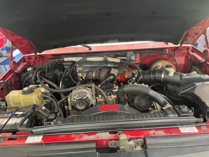 7.3L V8 turbo diesel engine paired with an automatic transmission. It has