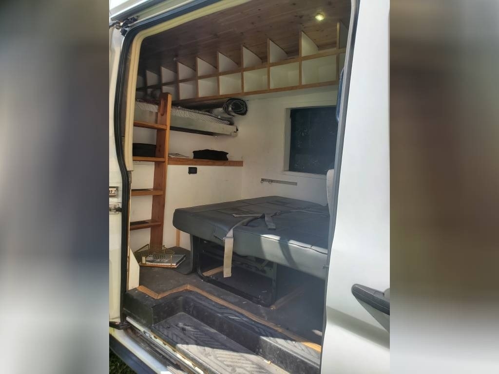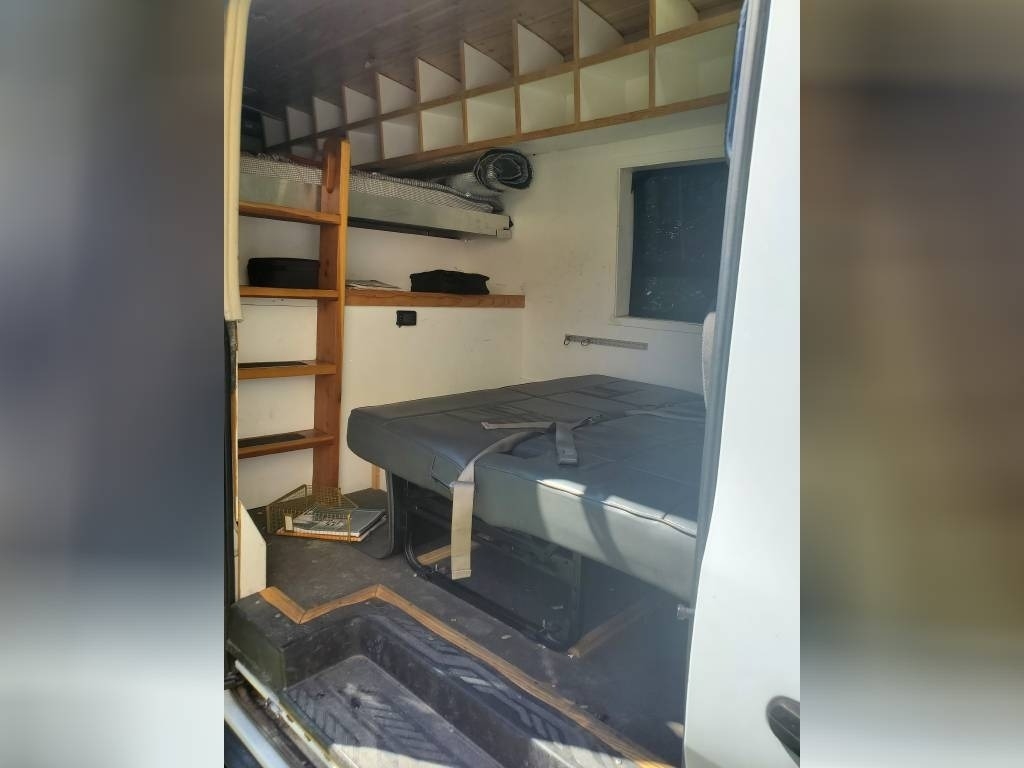 has a high roof, extended body, rear ladder, Maxx air fan, roof rack and dually