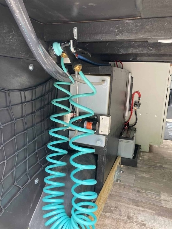 garage hose, water purifier, 5-gallon grey tank, 11 lb. propane tank feeds 2