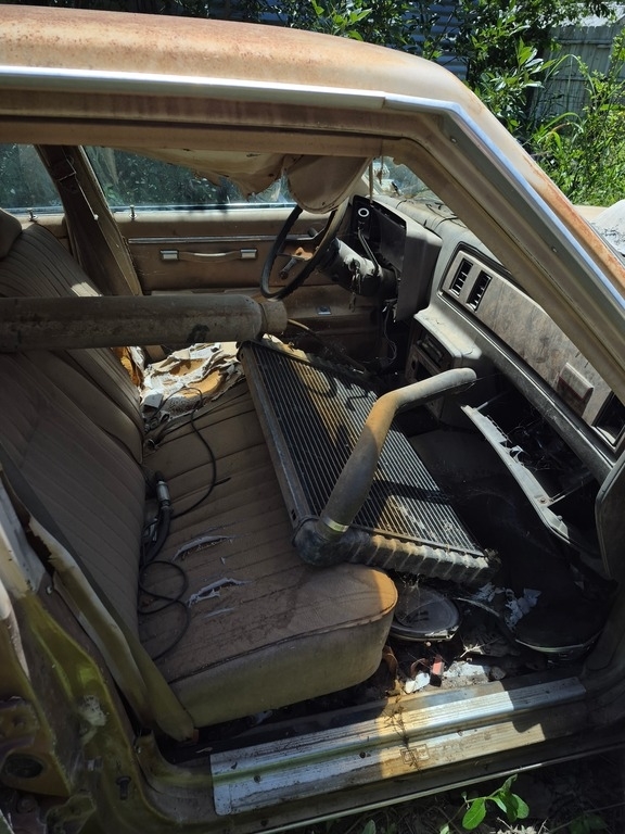 This Malibu does not run and will require towing. It’s been off the road for years. The body has a damaged hood, damaged right, and worn paint. The interior is mostly intact but aged, with original tan cloth seats and bench seating front and back.