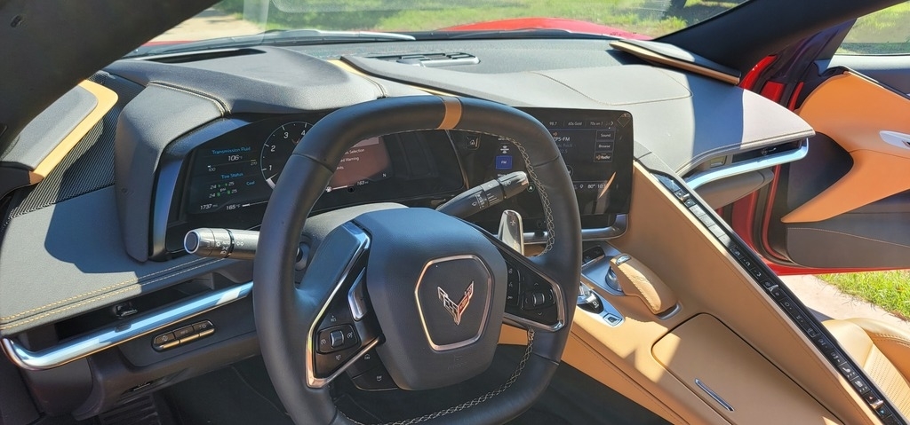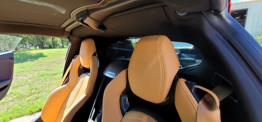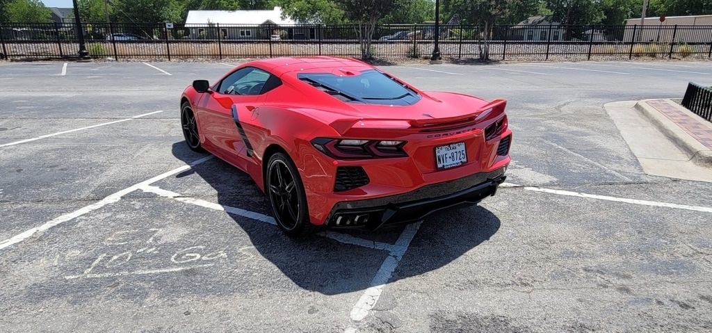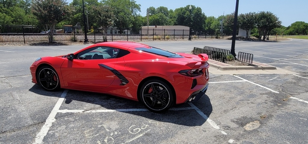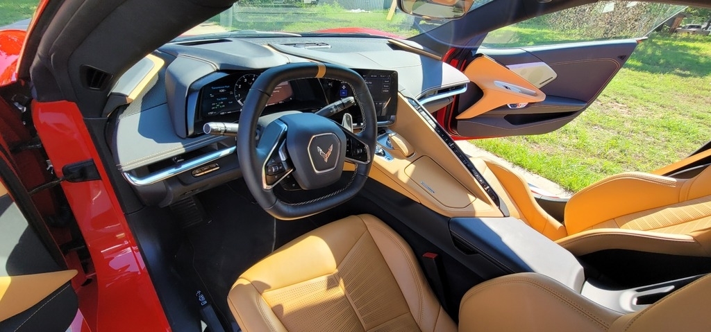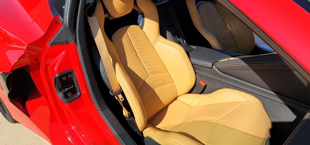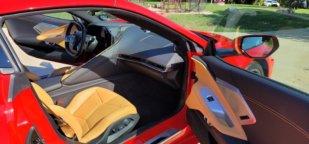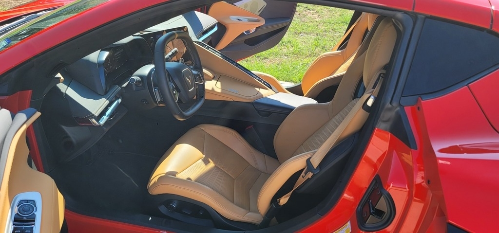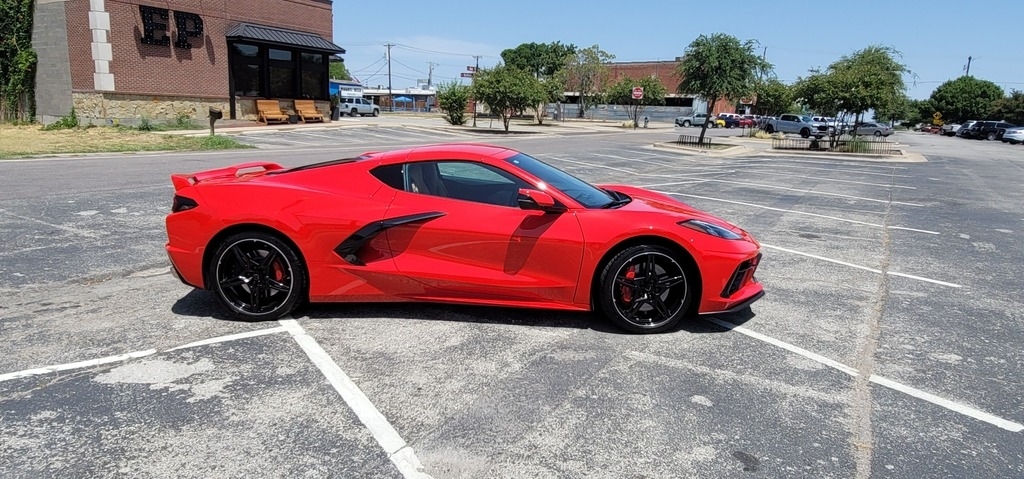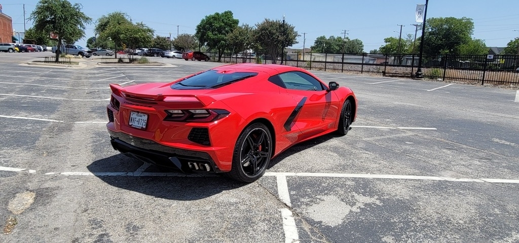 This 2020 Chevrolet Corvette Stingray Coupe is powered by a 6.2L V8 gasoline engine paired with an 8-speed automatic transmission. This Corvette Stingray is shown in Torch Red with a tan interior.