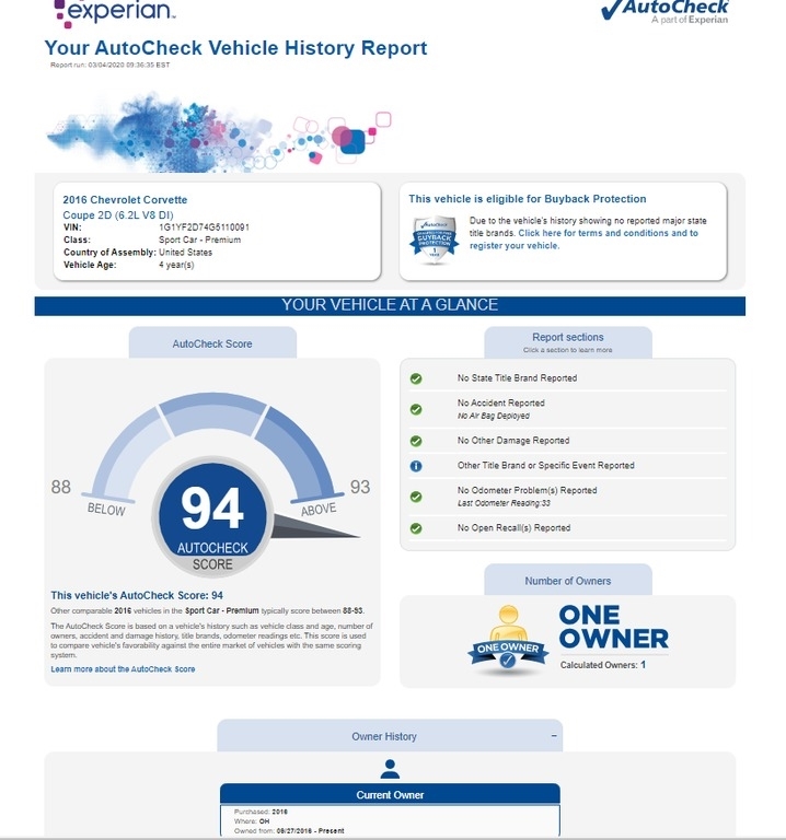 Chevy Corvette is powered by a 6.2L, 460HP V8 Engine with 2,216 miles on