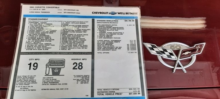 This Corvette is Powered by a 5.7L Fuel Injection V8 Engine paired with a 6-Speed Manual Transmission with only 64,000 Miles. Shown with a 50th Anniversary Red Exterior and Tan Leather Interior this Corvette is Garage Kept and Well Maintained.