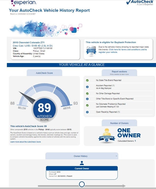 This 2018 Chevrolet Colorado is powered by a 2.8L, I4 Diesel Powered Engine with 68,000 miles on it, paired with a 6-Speed Automatic Transmission. This beauty is shown in Silver Ice Metallic with a Jet-Black Interior and has been non-smoking. Original Manufacturer Warranty and Transferable Extended Warranty of 100,000 miles.