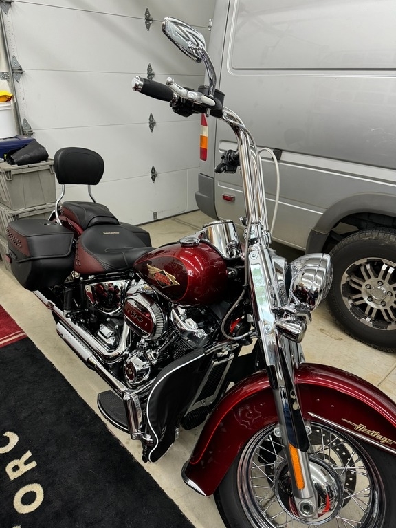 This limited-production 2023 Harley-Davidson Heritage Classic 120th Anniversary Edition is a true collector’s piece — #1265 of only 2,000 built worldwide. Finished in stunning Heirloom Red Fade with gold detailing and anniversary badging, it blends timeless Harley styling with modern performance and comfort.