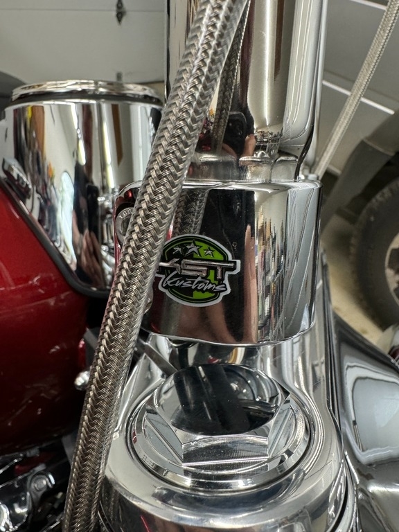 Handles Beautifully in the Curves and on the Highway — Plush Yet Stable with its Upgraded KST Kustoms 14” Adjustable Ape Handlebars, Steel Braided Clutch and Brake Lines, and Custom Grips and Pegs for Long-Ride Comfort.