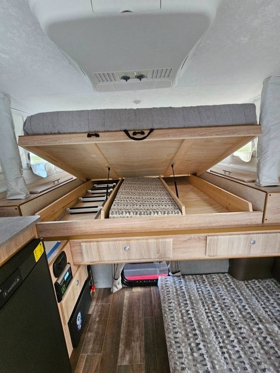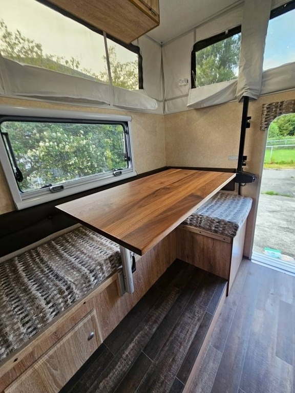 “Pop-up campers are lighter with a much lower profile. They don’t catch as much wind on the road and the center of gravity is lower. Mine has most all the extra options and was one of the last TC800s produced. Fits on short or long bed trucks. It has been stored inside when not in use. Sleeps 3: True Queen N/S over cab (w/ ladder) + extra, extra long, 36” wide twin at dinette. Seating for 3 – 4 around dinette w/ insulated, crank out window w/ shade & screen. 12,000 BTU Furnace – thermostat and auto ignition. 3-way Dometic 3.7 L Refrigerator (electric, gas, battery). 30 amp electric, 30-amp twist adapter w/ 15-amp lighted power cord. 170-watt solar panel, 2 batteries, 30-amp controller. 2 Dometic burner stove top w/ glass top. Sink w/ pull-out sprayer faucet w/ 7.5-gal gray + one touch hot water heater. Lagun swing away table system. Outdoor shower. 30-gal freshwater w/ large cleaning port. Sub Zero package + insulated floor. Power Jacks and power roof lift. 6’ Awning + exterior lights and accent lights. Rear wrap around rear w/ storage. Extra overhead cabinets in galley, bedside storage, & underbed w/ 2 gas struts. Screened entrance door (49” tall) with window, deadbolt, screen, and gas strut. Maxxfan Plus, roof A/C. 4 Step scissor step – stow and go. Rear ladder for attaching bikes, etc. Interior height: closed 4’ 8” and open 6’ 8” – when close still access to refrigerator, sink & table. Floor length = 8’ Overall = 14’ 6” + back steps. Closed body height = 5’ 6” + ~ 10” for roof equipment = 6’ 5”. Extras: truck extended mirrors, pots / pans, privacy tent, folding toilet & bags, fitted Queen sheet, floor mat, leveling pads, Torklift tie-downs, heavy duty storage platform with wheels …”