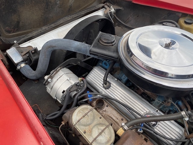 This Corvette is powered by a 350 V8 engine paired with a 4-speed manual transmission. It has 110,000 miles and is shown with a red exterior and an oyster interior. This vehicle has been well-maintained.