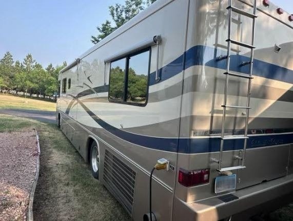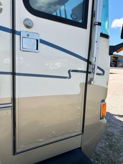 Disclosure: This 2000 Country Coach Allure Millennium Edition retailed for $207,150 dollars. Normally this Coach would book for over $60,000 dollars. When we bought this coach there was some rust on the entry door to the coach (which is still there today), Also he had backed into something that dented the right side of the top of the coach’s ladder and put a small crease in the roof (which he had fixed). Front left driver's side windows - the Swiggle seal window spacer expanded due to heat and are visible within the window space. There is no issue, seals are good, don’t leak, or fog up, it was that way when we bought the coach.”