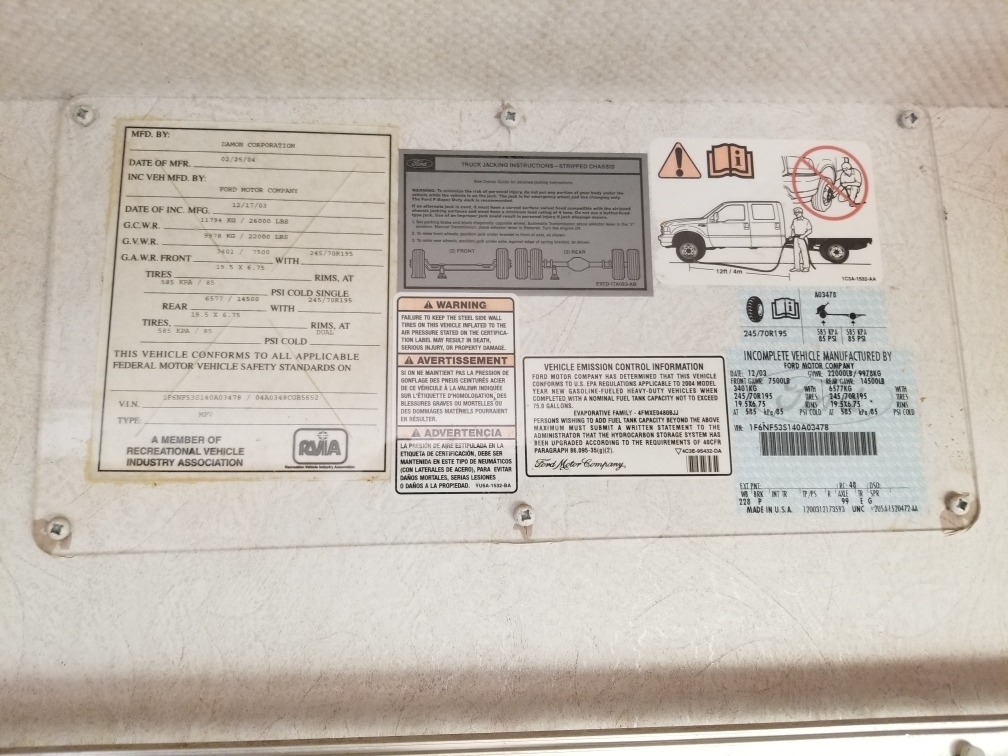 This 2004 Damon Challenger is Powered by a 305HP Ford Triton V10 Gas Engine, Paired with a 5-speed Torque Shift Automatic Transmission, and Driven on a Ford F53 Chassis, with ONLY 36,000 Original Miles! The Overall Length is 36 feet and Comes Equipped with an Onan 5.5KW Generator, 2 Full-Body Slide Outs, 1 Awning, 2 A/C Units, and Plenty of Room to Sleep 4.