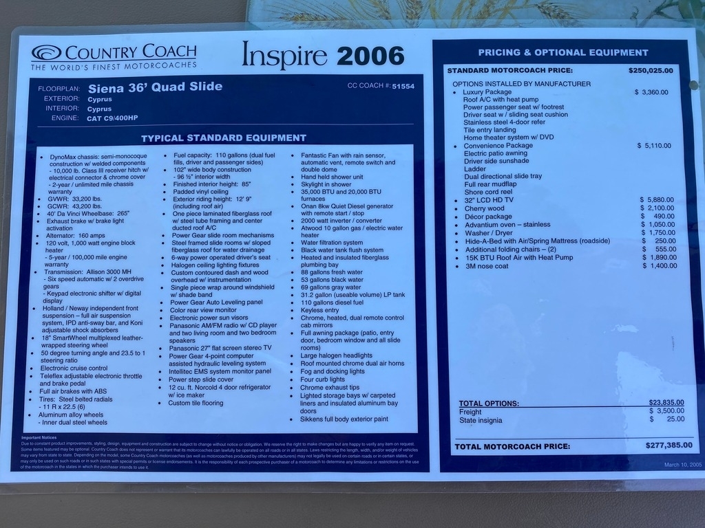 This 2006 Country Coach Inspire has an Overall Length of 38 Feet and Comes Equipped with 4 Slide Outs, 1 Power Awning, 2 A/C Units, and Plenty of Room to Sleep 5. It is Powered by a 400HP Caterpillar C9 Diesel Pusher Engine, Paired with an Allison 6-Speed Automatic Transmission, and Driven on a DynoMax Chassis. This Inspire has ONLY 22,000 Original Miles!! It is a Non-Pet/Non-Smoking Motorhome and there have not been any Accidents or Water Damage.