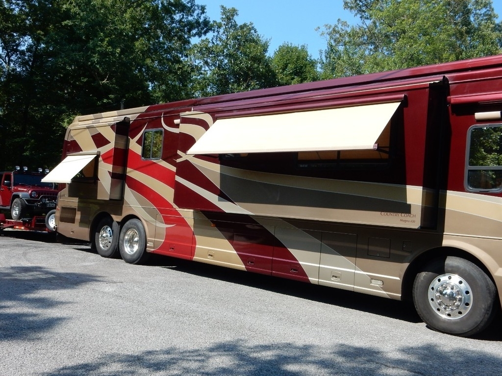 This 2008 Country Coach Magna is Powered by a 625P Caterpillar C-15 Diesel Pusher Engine with Only 62,100 Miles! It’s Paired with an Automatic Transmission and Driven on a DynoMax Chassis. The Overall Length is 45 Feet and it Comes Equipped with 4 Slide Outs, 5 Awnings, 3 AC Units, and Plenty of Room to Sleep 6. This is a Non-Pet/Non-Smoking RV and has had No Accidents or Water Damage.