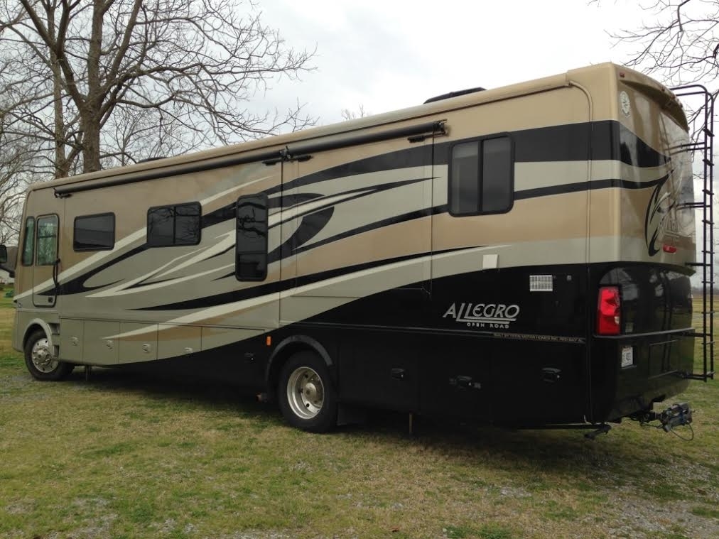 Beautiful Class A motor home with low miles For Sale! This RV has a 6.8L V10 Ford engine on a Ford 24000 Chassis with 22.5 wheels. It has Gold Coral full body paint complimented with Marble interior. Top quality Tiffin manufactured Allegro Bay, Open Road model. 36.5 Feet long with 2 slides including full living area slide and bedroom Slide out. Floor plan includes rear living with large leather couch and separate leather recliner. This Class A RV has many great features including: Electric heater fire place. 3 flat screen TVs with large 42inch over fireplace. Surround sound with universal infrared remote wired throughout coach. 1.5 baths with full bath and shower in the back and 1/2 bath mid-coach. There is a 3 burner stove. Four door refrigerator with ice maker, runs off both gas and electric. Winegard automatic satellite dish mounted on roof. Full electric awning. 2 Air conditioners cool cab even on hot days. Gas and electric heat. 7000 Onan Generator can power your coach and your friends. Lots of storage with easy side open outdoor compartments. There is an extended warranty until April 2017.