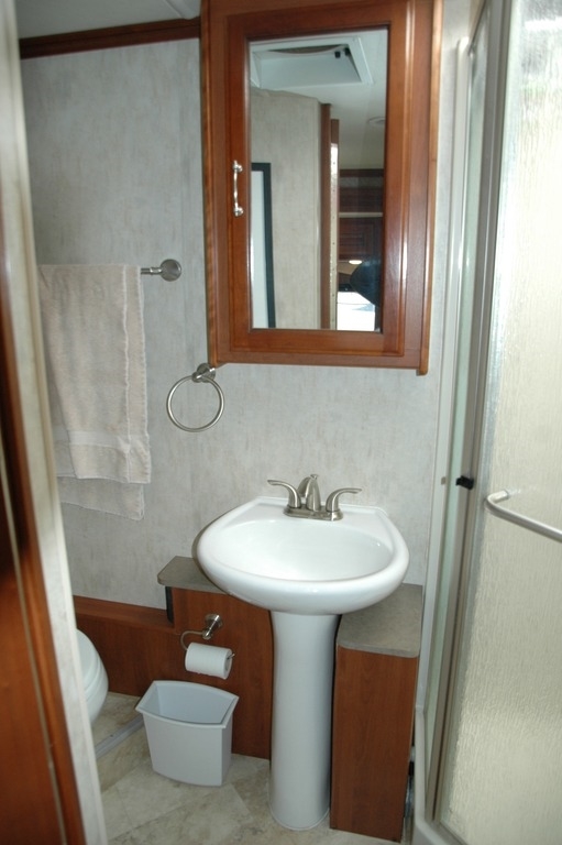 The side aisle bathroom is on the left as you proceed to the rear of the motor home. In the bathroom you will find a linen cabinet, corner angle shower, sink, and a toilet.