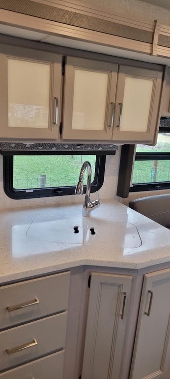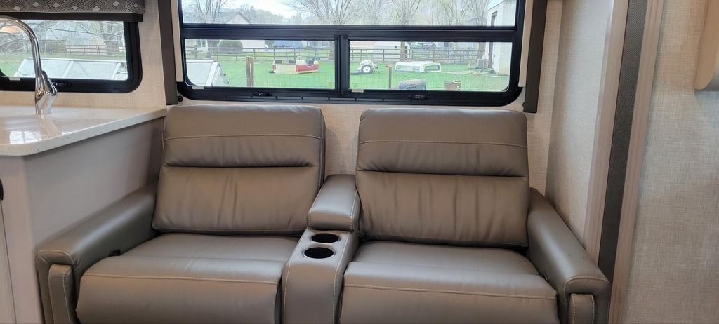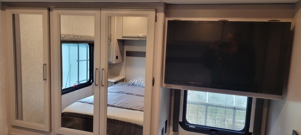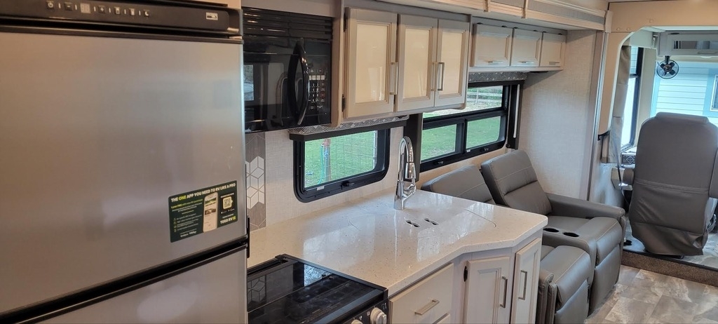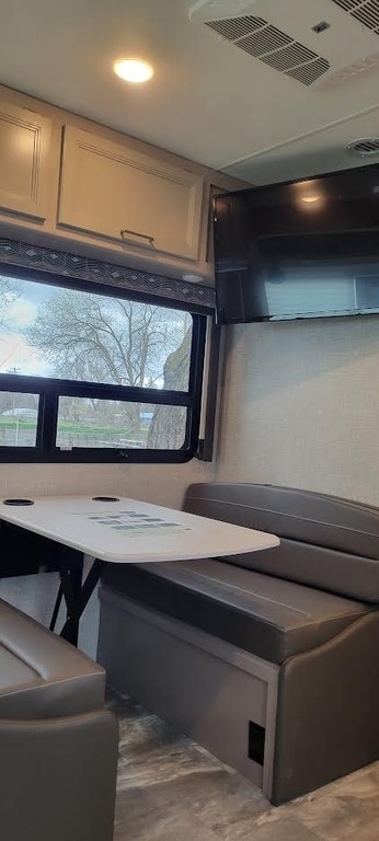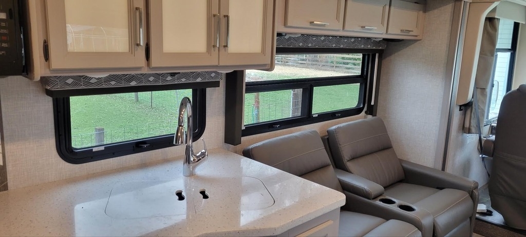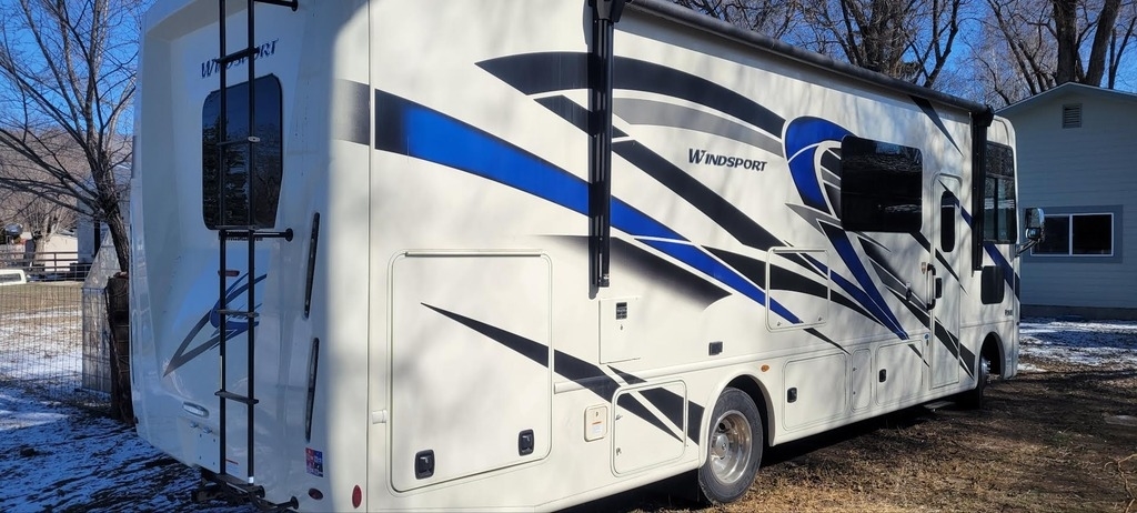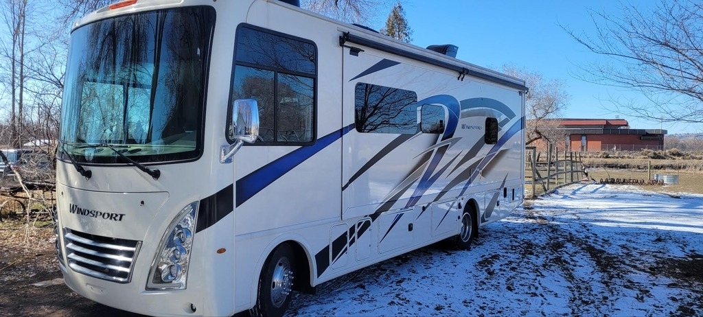 Have you been daydreaming about traveling the countryside with your spouse? Are you looking for additional sleeping space on occasion? This Windsport Class A gas motorhome will have you sitting by your number-one person in comfort and style. This unit features captain's chairs and a stow-away coffee table to enjoy your morning cup of joe, a 68" sofa bed for overnight guests, and a Dream Dinette all together providing enough seating for eight people to visit with one another. The Serta king bed in the rear bedroom allows you to sleep in comfort anywhere you decide to stay. The chef will appreciate all the kitchen amenities inside when making meals and outside when making dinner using the exterior kitchen. This unit also includes an exterior 32" TV, and if you prefer to watch television when inside, you will find a 39" TV in the living area and 32" TV in the bedroom!