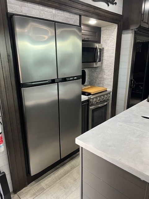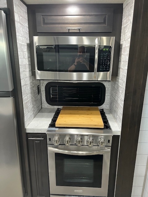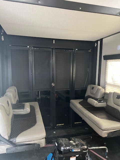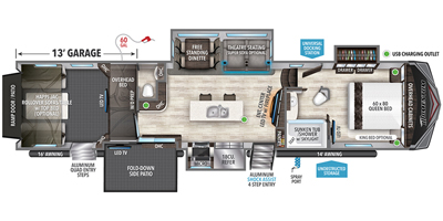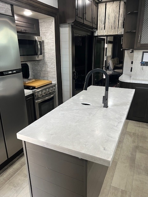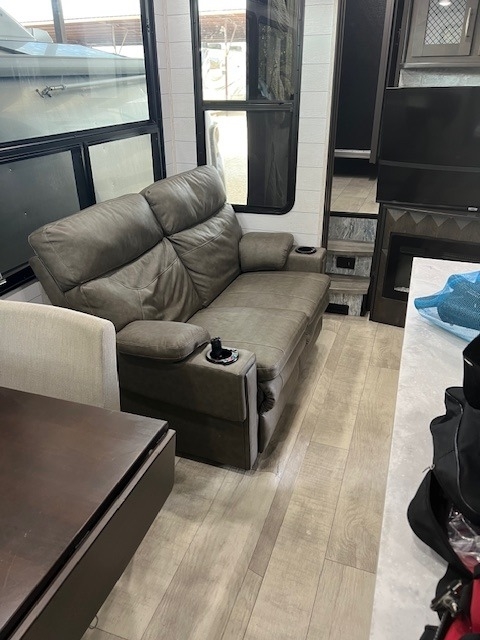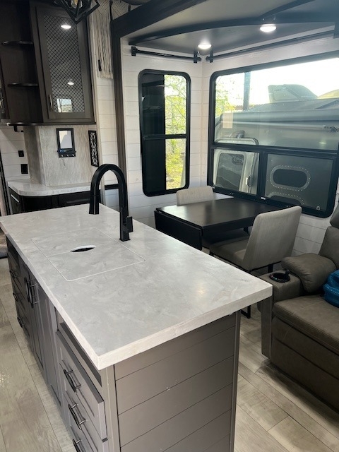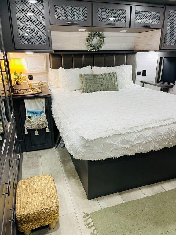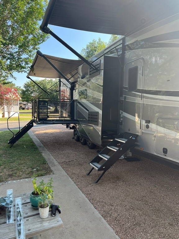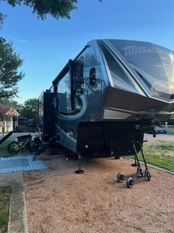 This Momentum has an overall length of 43.08 feet and comes equipped with 3 power retractable slide-outs, 3 power retractable awnings, 3 A/C units, a washer/dryer combo, a generator, a solar panel, 2 patios, and plenty of room to sleep 6. This unit has been well-maintained.