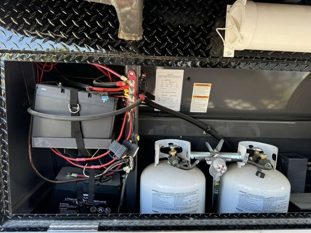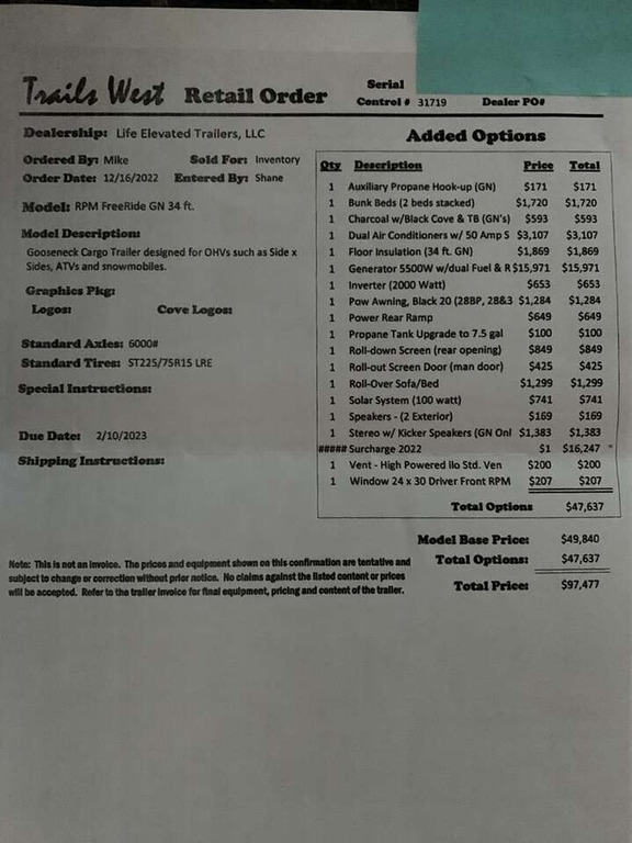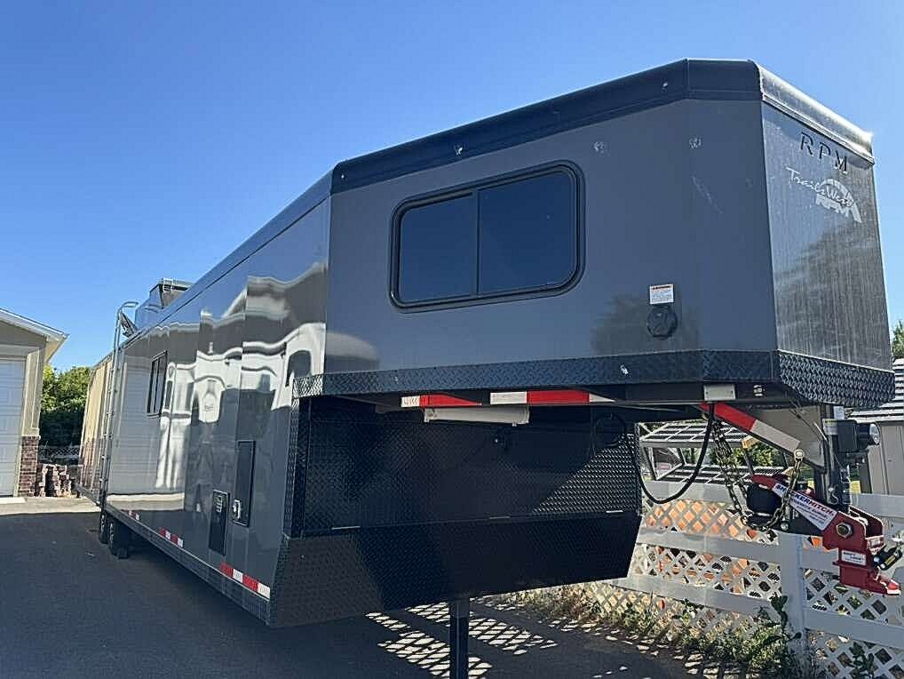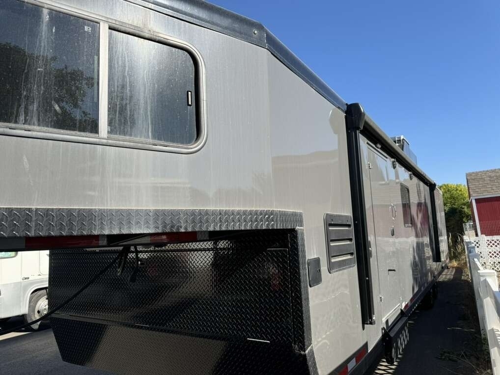 “2023 Freeride Trails West 34’ Gooseneck Trailer like new with a clean title. This versatile trailer includes a new Shocker Hitch and lock and is designed to haul two UTVs, cars, snowmobiles, motorcycles, or any of your important gear, while still providing comfortable living space. Equipped with numerous upgrades, this trailer is perfect for off-grid adventures. It features a Nectar mattress, insulation, TV, solar panels, generator, and inverter, ensuring you have all the comforts of home while on the road. For detailed specifications, refer to the build sheets. This is a must-see trailer with everything you need for an enjoyable and convenient experience.”