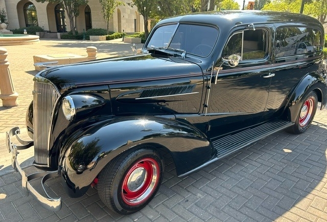 “Up for sale we have a 1937 Chevy Delivery Panel. This is a well-done street rod that has a GM 350 crate motor and T.C.T 350 transmission with less than 300 test miles. Runs and drives like a jewel. The body is all steel with rear fiberglass fenders and running board. The original steel rear fenders come with the car. The paint is done in Tuxedo Black paint that is accented by the red pin stripping. The paint shows very well with some beauty marks and paint chips. The chrome and stainless has been re-chromed and polished. Sitting on a set of red steel wheels with chrome caps and rings. On the inside, its done in gray silver contemporary woven upholstery. The column is a tilt column with a Billet Banjo wheel.”