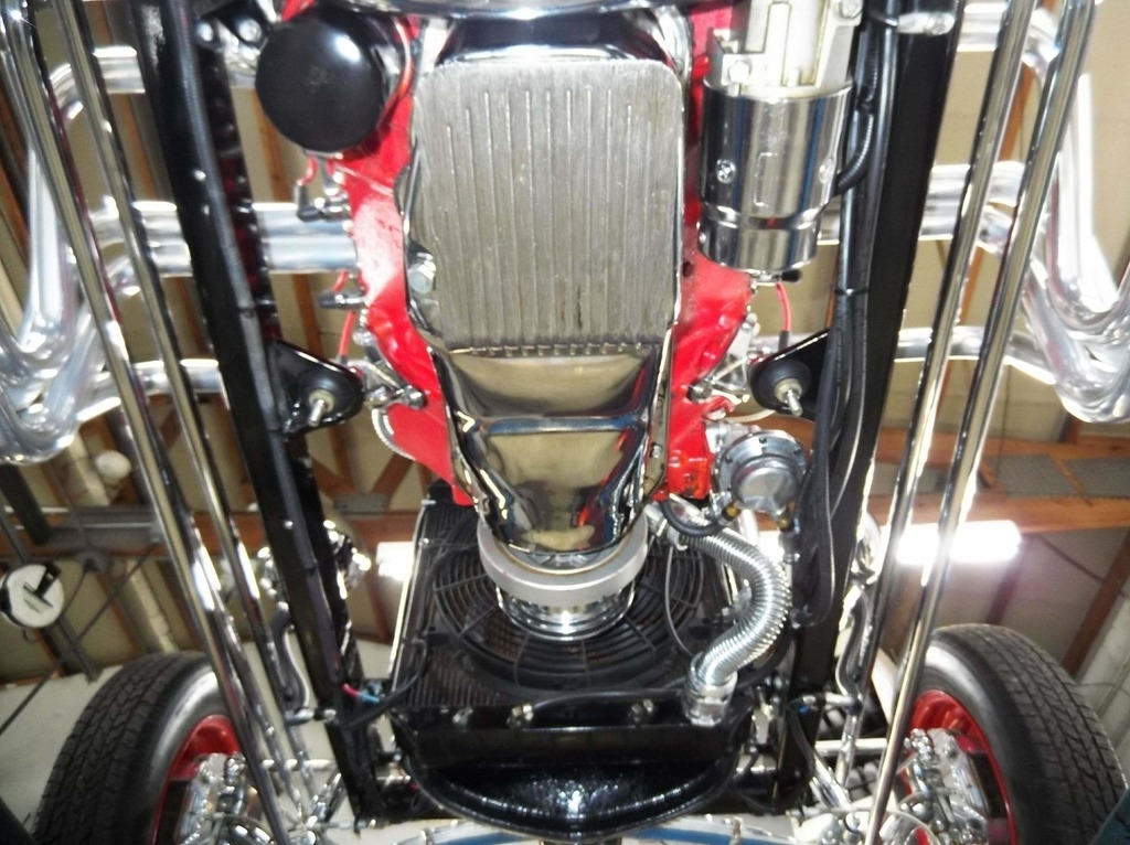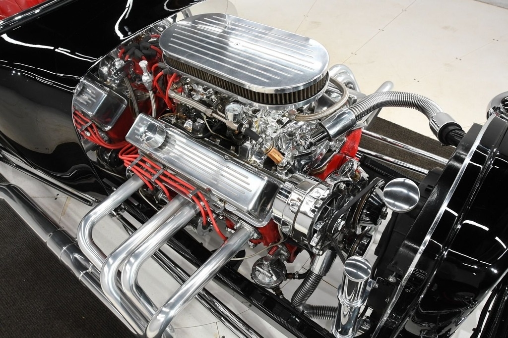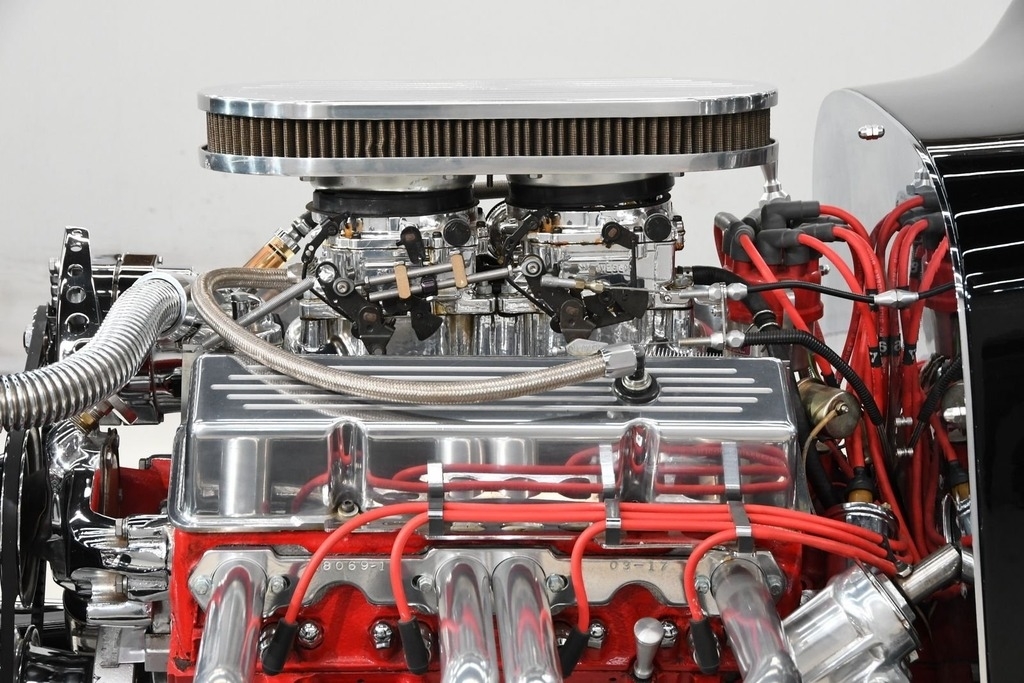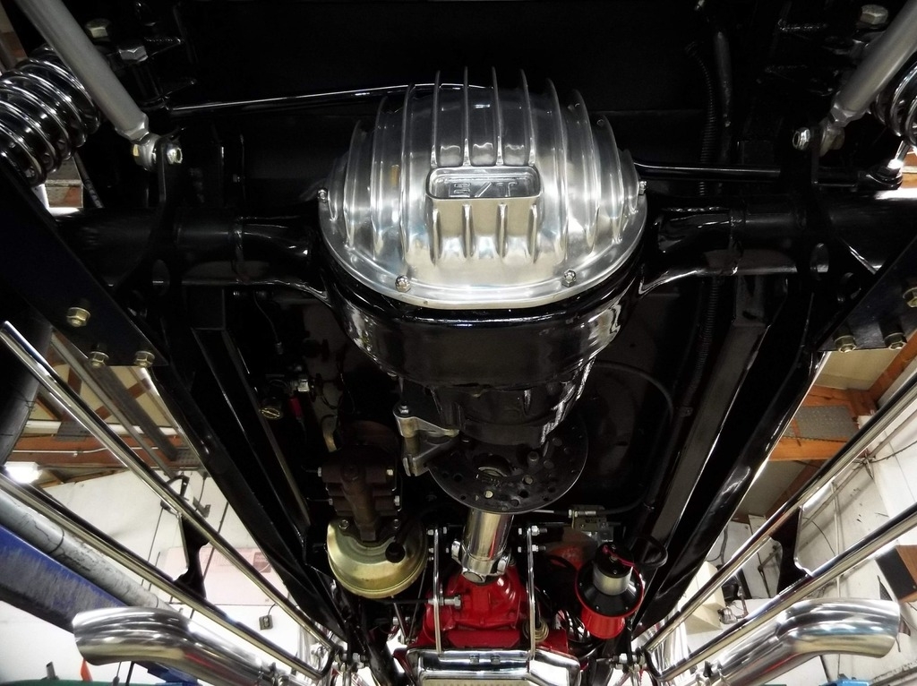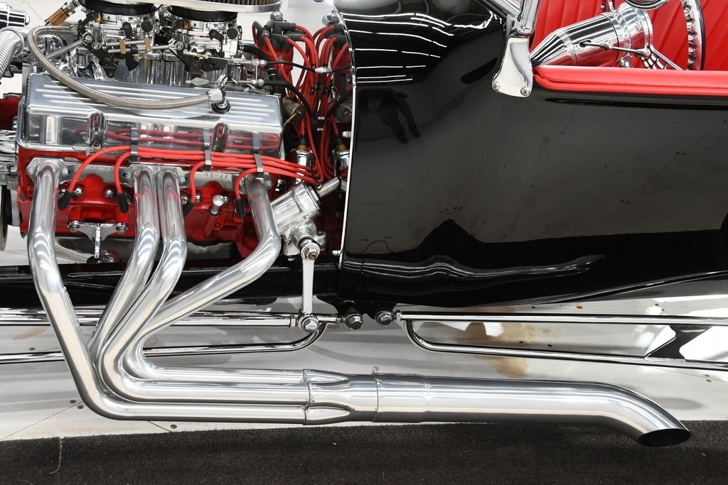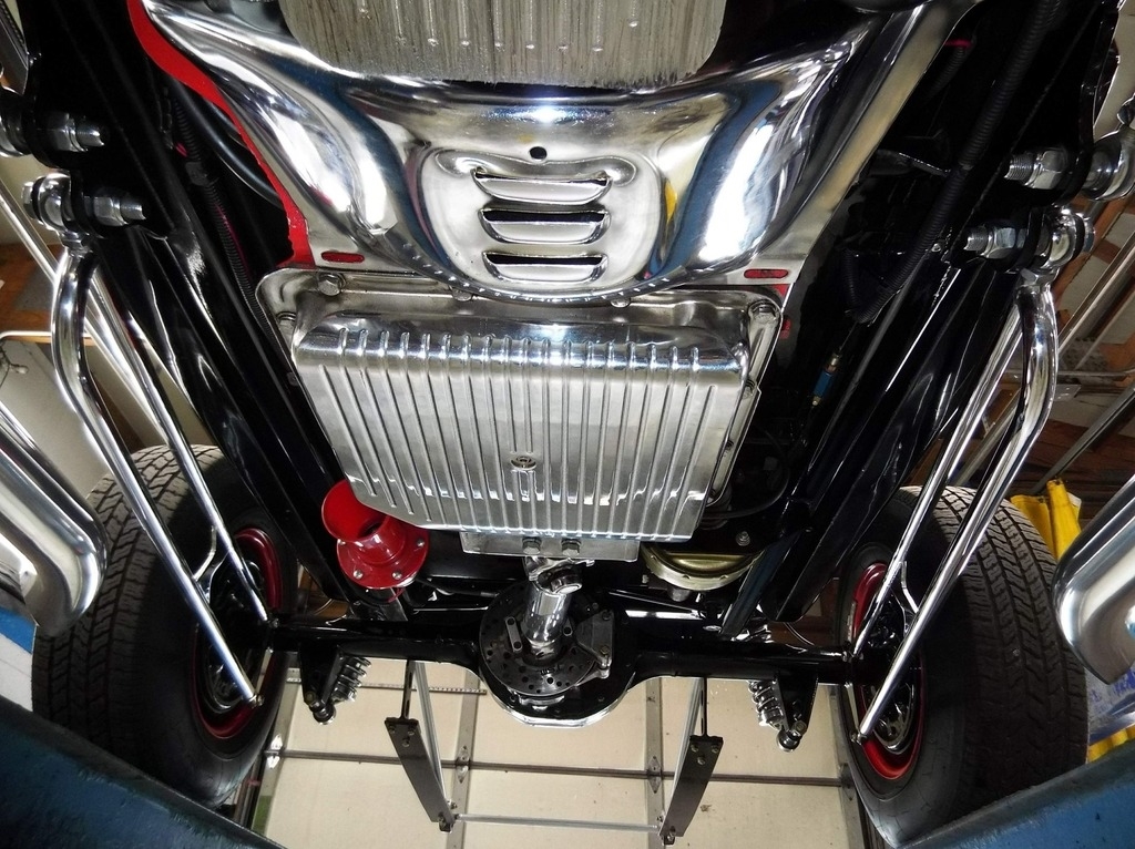The interior is just as impressive, featuring plush red custom upholstery, chrome tilt column, Lokar floor shifter, billet pedals, custom steering wheel, Ford gauges, and seat belts. Under the hood, the 327 Chevy small block shines with polished components, Edelbrock intake and carburetors, ceramic-coated headers, and a custom cooling system. The fully chromed underside, Wilwood Dynalite brakes, and polished Ford 9-inch rear complete this show-and-go build. Every detail was done right—this isn’t just a T, it’s a masterpiece ready to drive, show, and enjoy.”