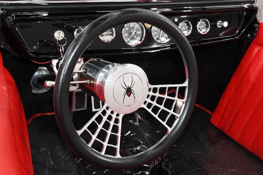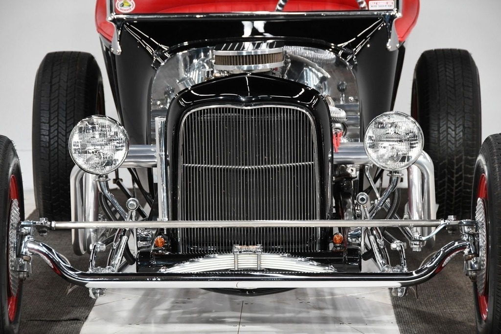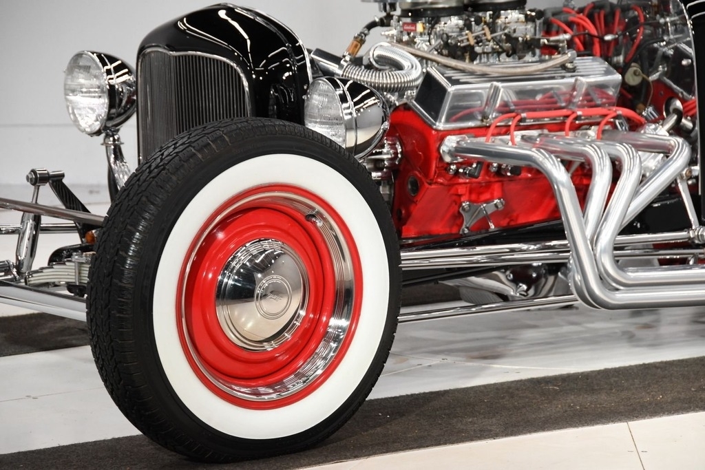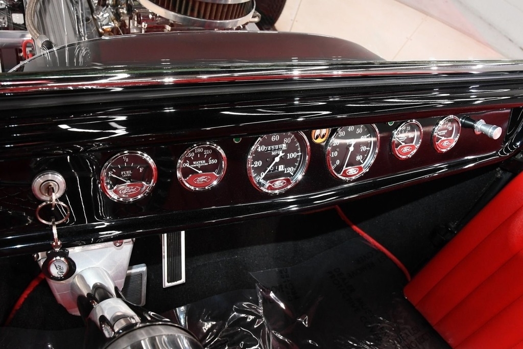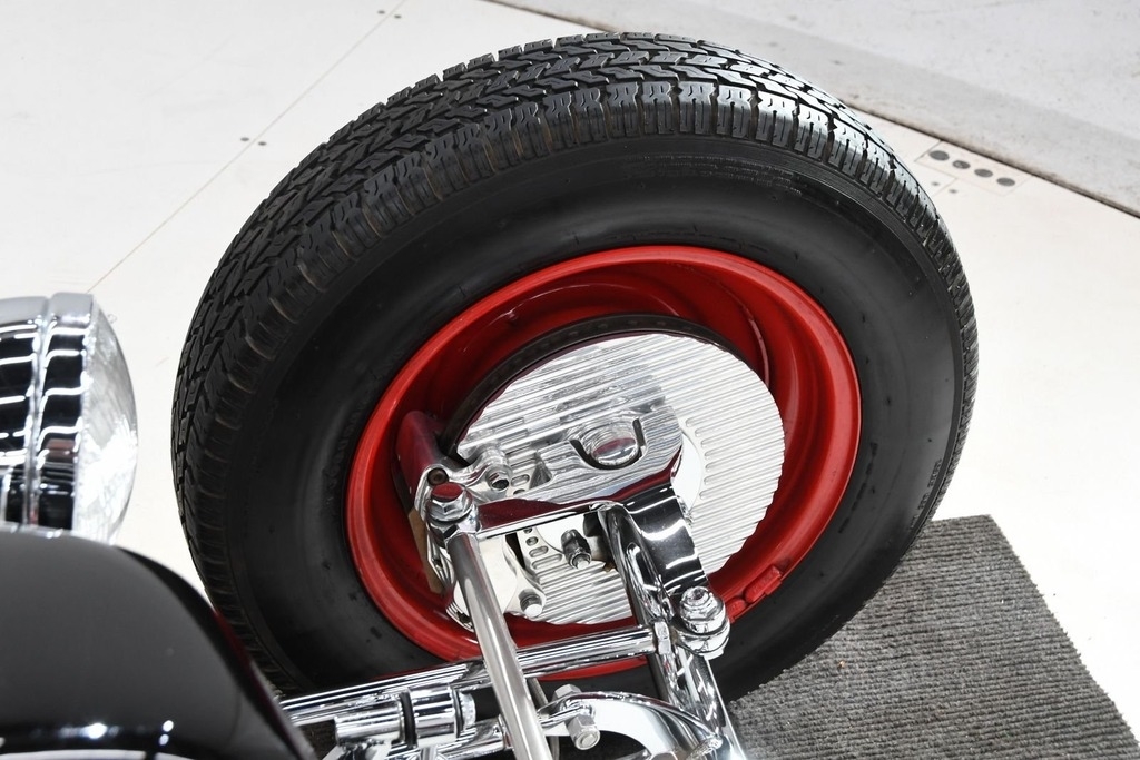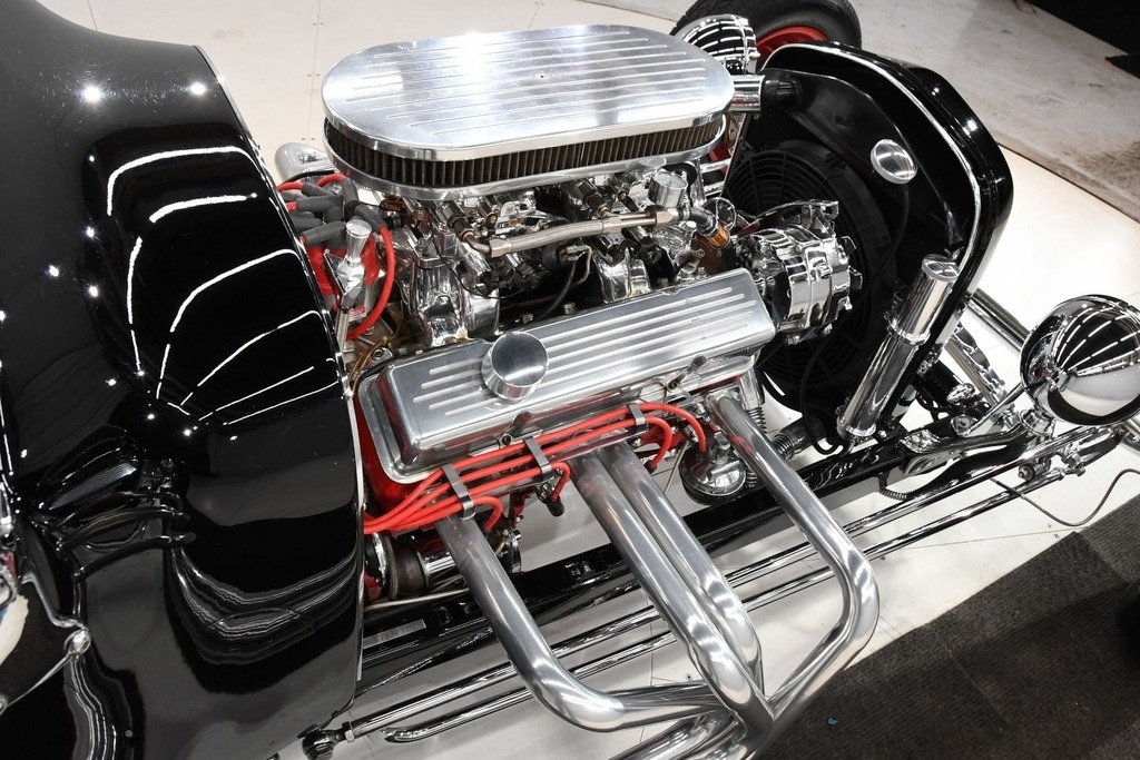 The interior is just as impressive, featuring plush red custom upholstery, chrome tilt column, Lokar floor shifter, billet pedals, custom steering wheel, Ford gauges, and seat belts. Under the hood, the 327 Chevy small block shines with polished components, Edelbrock intake and carburetors, ceramic-coated headers, and a custom cooling system. The fully chromed underside, Wilwood Dynalite brakes, and polished Ford 9-inch rear complete this show-and-go build. Every detail was done right—this isn’t just a T, it’s a masterpiece ready to drive, show, and enjoy.”