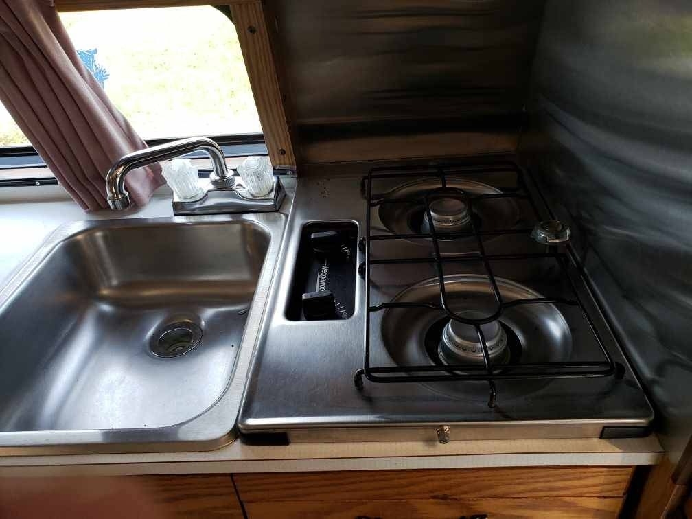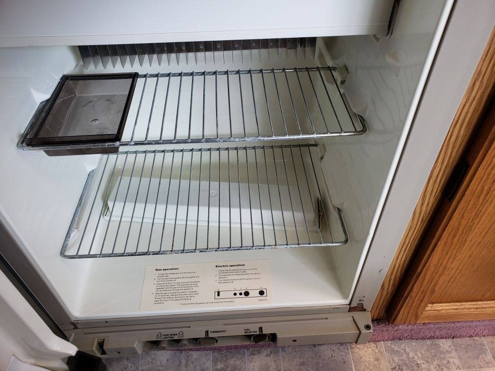 It has: Refrigerator (propane or electric), 2 burner propane stove, permanent