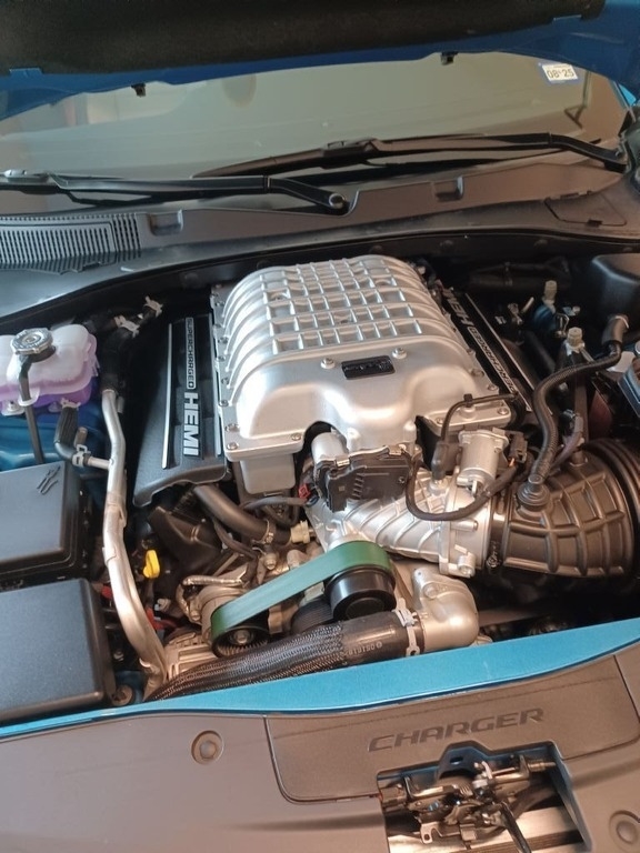 This Hellcat is powered by a 6.2L V8 supercharged engine paired with an 8-speed automatic transmission. It has only 1,843 miles and is shown with a B5 Blue Pearl Coat exterior and a gray and black interior. This vehicle has been well-maintained.