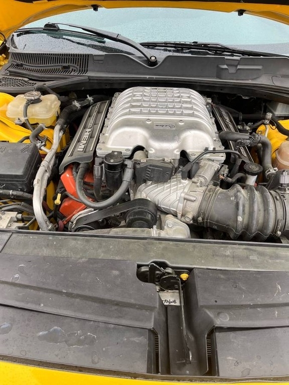 This Hellcat is powered by a 6.2L V8 supercharged engine paired with an 8-speed automatic transmission. It has 56,910 miles overall with approximately 12,000 miles on the new drivetrain and engine, and is shown with a Yellow Jacket clear coat exterior and a black cloth interior.
