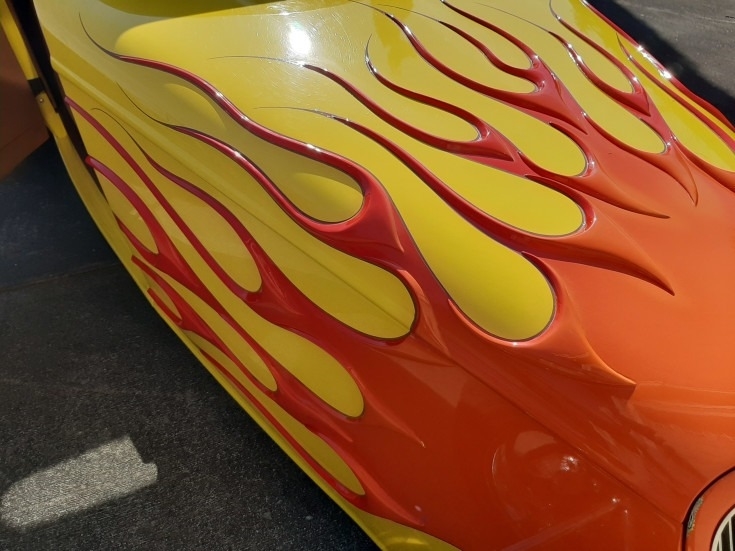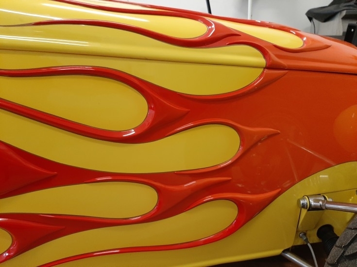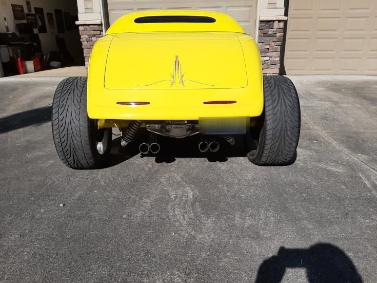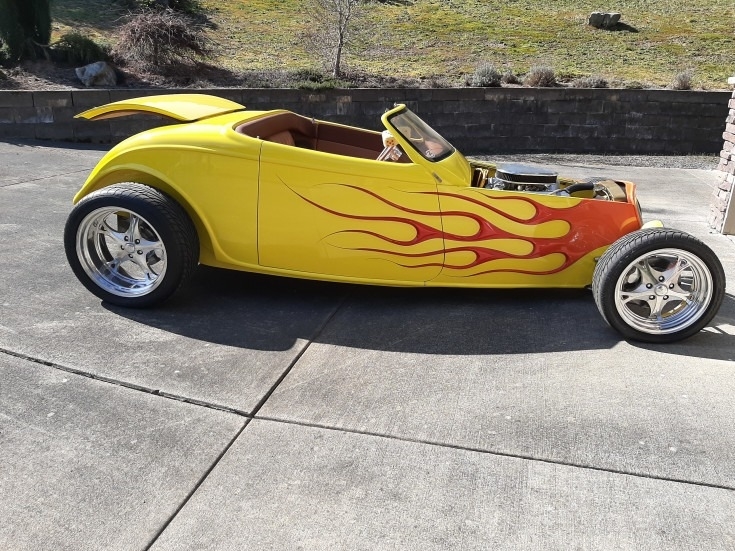 This sleek 1933 Ford Speedstar Roadster is powered by a 500HP 468 Big Block V8 Engine, Paired with a 700 R4 Automatic Transmission with Overdrive and ONLY 4,000 Miles! This hotrod with a liftoff hard-top has a fiberglass body sports a Yellow exterior with raised 3-D Flames , and a Tan/Mocha interior. Non-smoking, Garage Kept.